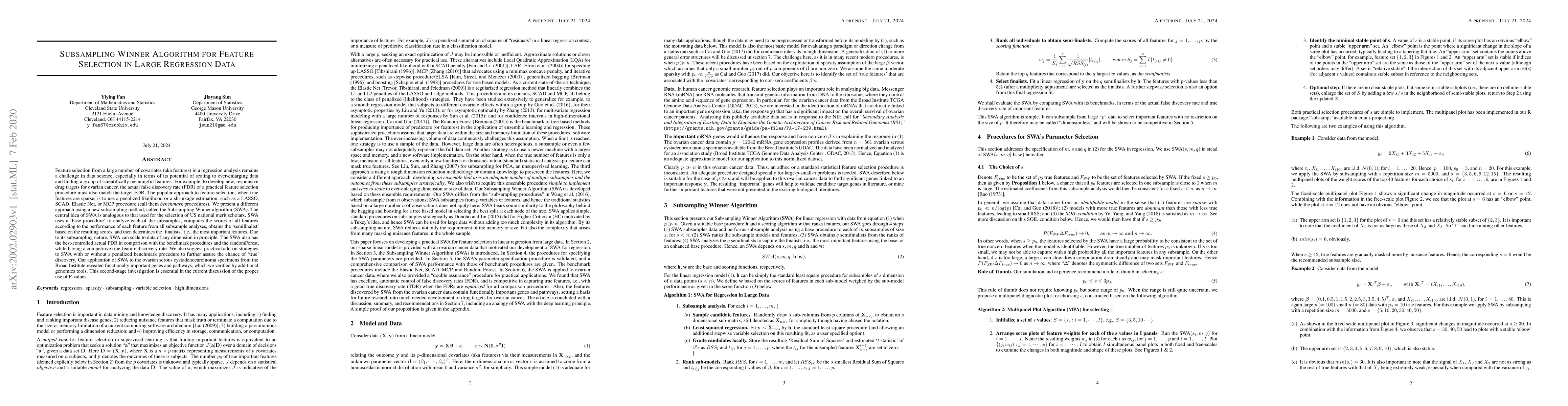 The paper introduces the Subsampling Winner Algorithm (SWA), a scalable method for selecting important features in large regression datasets that controls false discoveries better than traditional methods. Applied to ovarian cancer data, SWA identified key genes and pathways, demonstrating its effectiveness in real-world genomic research.