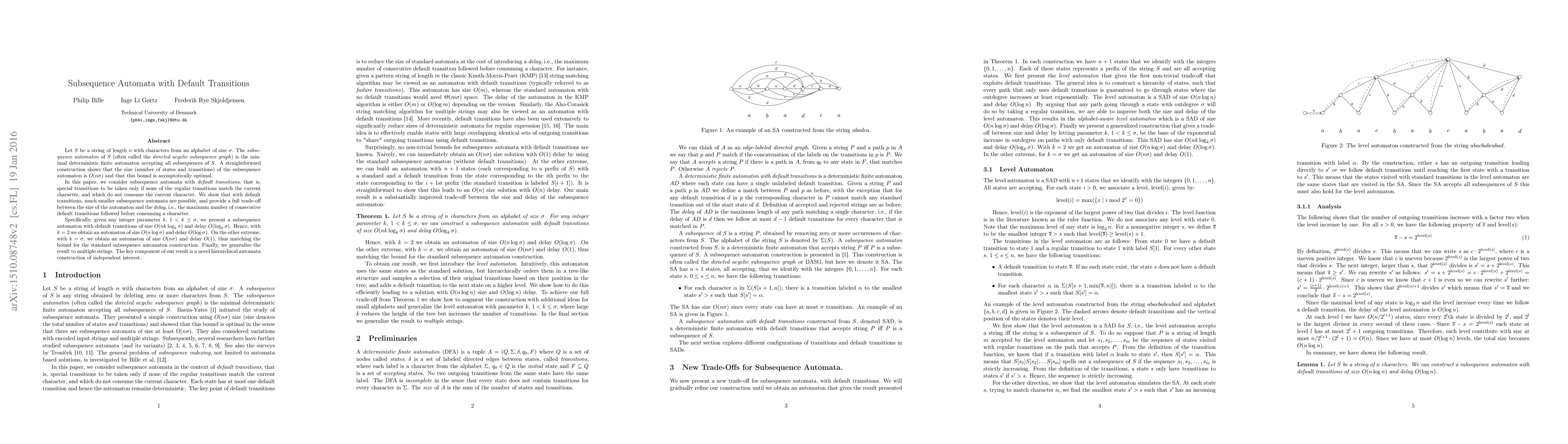 This paper introduces subsequence automata with default transitions, which significantly reduce the size of automata accepting all subsequences of a string. With a parameter k, these automata have a size of O(nk log_k σ) and a delay of O(log_k σ). The method uses a novel hierarchical automata construction, offering a trade-off between size and delay, and generalizes to multiple strings.