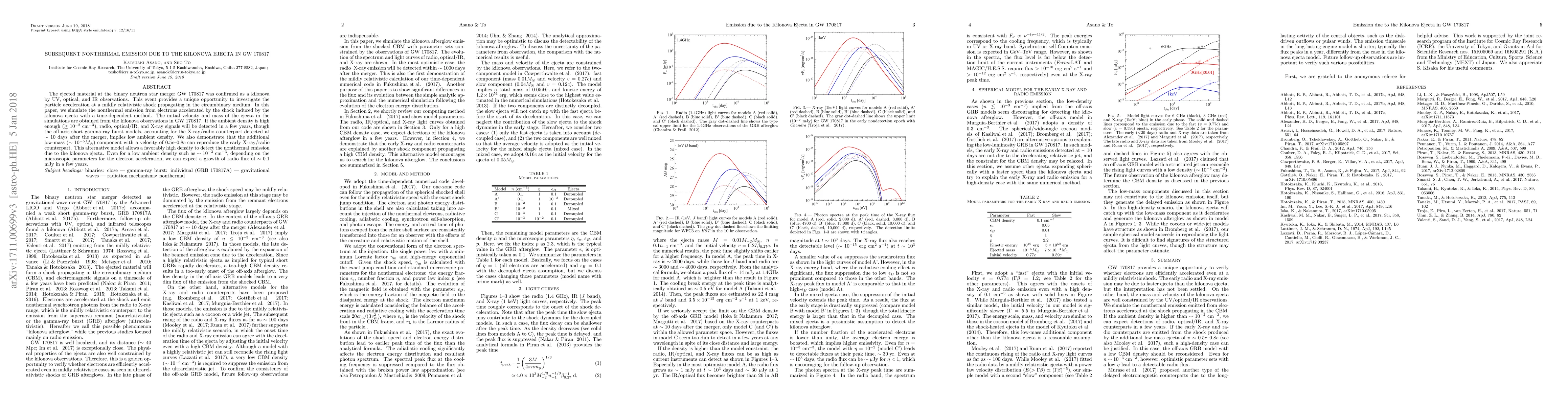 The ejected material at the binary neutron star merger GW 170817 was confirmed as a kilonova by UV, optical, and IR observations. This event provides a unique opportunity to investigate the particle acceleration at a mildly relativistic shock propagating in the circumbinary medium. In this paper, we simulate the nonthermal emission from electrons accelerated by the shock induced by the kilonova ejecta with a time-dependent method. The initial velocity and mass of the ejecta in the simulations are obtained from the kilonova observations in GW 170817. If the ambient density is high enough ($\geq 10^{-2}~\mbox{cm}^{-3}$), radio, optical/IR, and X-ray signals will be detected in a few years, though the off-axis short gamma-ray burst models, accounting for the X-ray/radio counterpart detected at $\sim 10$ days after the merger, implies low ambient density. We also demonstrate that the additional low-mass ($\sim 10^{-5} M_\odot$) component with a velocity of $0.5 c$--$0.8 c$ can reproduce the early X-ray/radio counterpart. This alternative model allows a favorably high density to detect the nonthermal emission due to the kilonova ejecta. Even for a low ambient density such as $\sim 10^{-3}~\mbox{cm}^{-3}$, depending on the microscopic parameters for the electron acceleration, we can expect a growth of radio flux of $\sim 0.1$ mJy in a few years.
