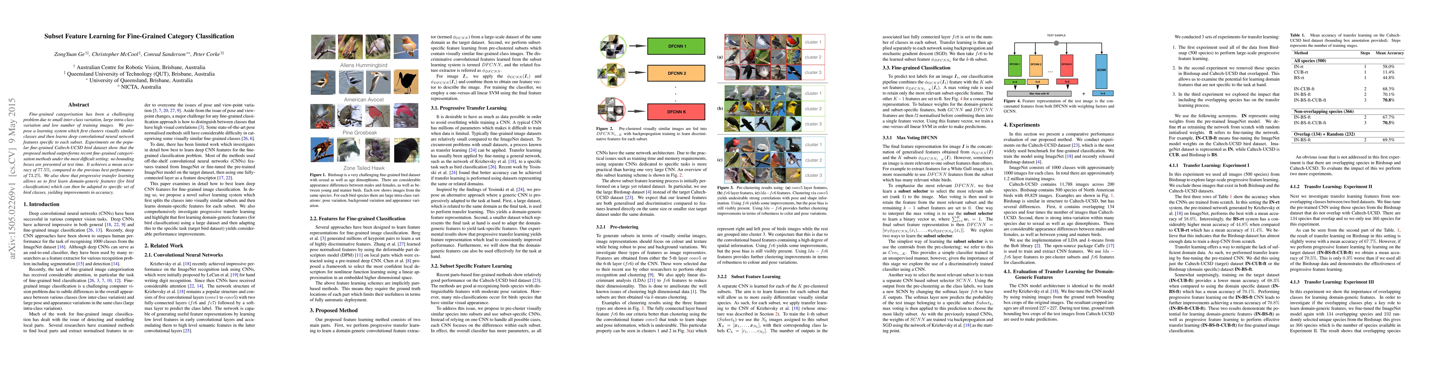 This paper proposes a subset feature learning system for fine-grained category classification, which clusters visually similar classes and learns deep CNN features specific to each subset. The method achieves a mean accuracy of 77.5% on the Caltech-UCSD bird dataset, outperforming previous methods.