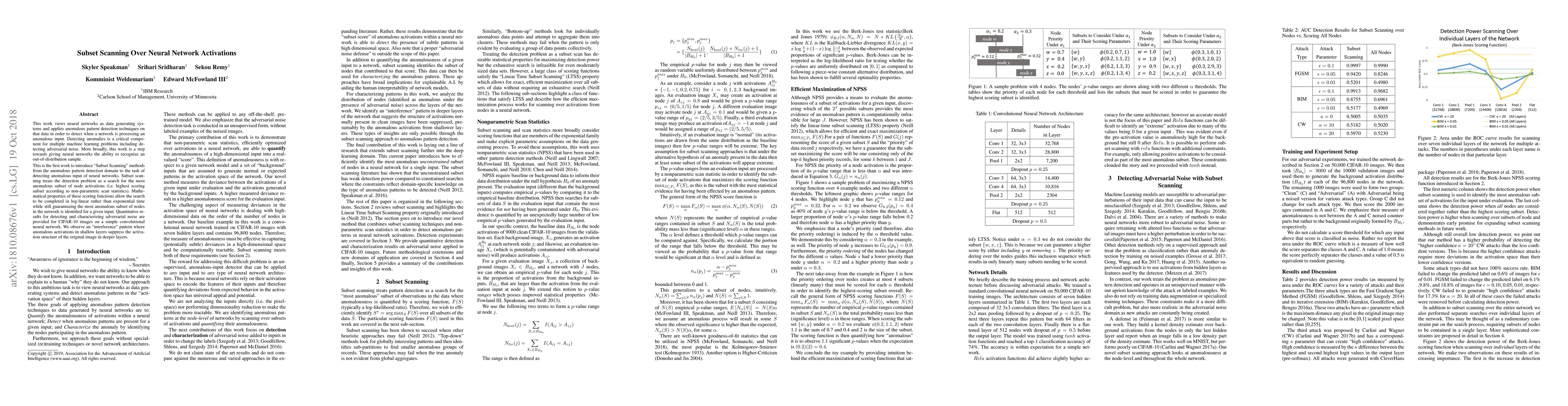 This paper introduces "Subset Scanning" methods to detect anomalous inputs in neural networks by identifying the most anomalous subset of activations, achieving log-linear time complexity. It demonstrates effectiveness in detecting adversarial noise in CIFAR-10 images, showing an interference pattern where shallow layer anomalies suppress deeper layer activations.