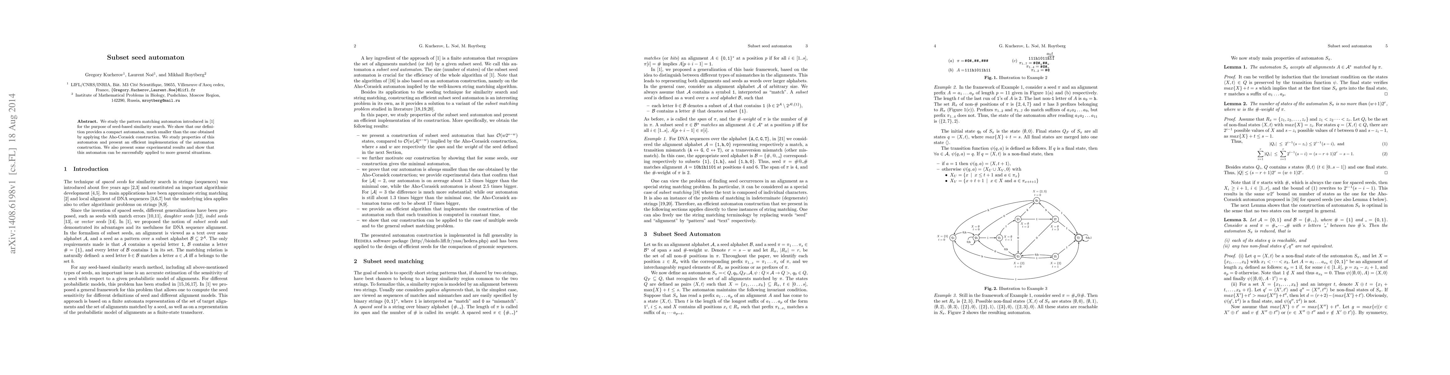The paper investigates a compact pattern matching automaton for seed-based similarity search, demonstrating it is significantly smaller than the Aho-Corasick construction. It provides an efficient implementation and shows successful application in broader contexts through experimental results.