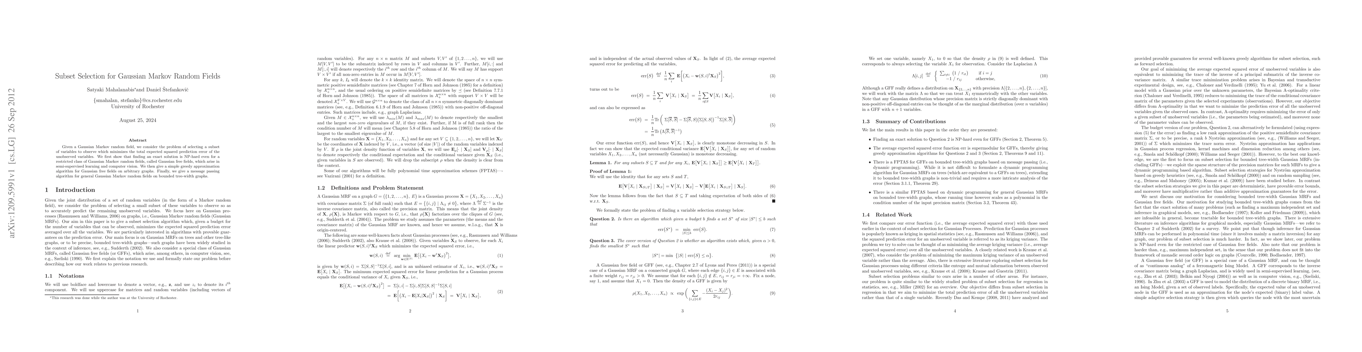 This paper addresses the NP-hard problem of selecting a subset of variables in Gaussian Markov random fields to minimize prediction error. It proposes a greedy approximation algorithm for Gaussian free fields and a message passing algorithm for general fields on bounded tree-width graphs.