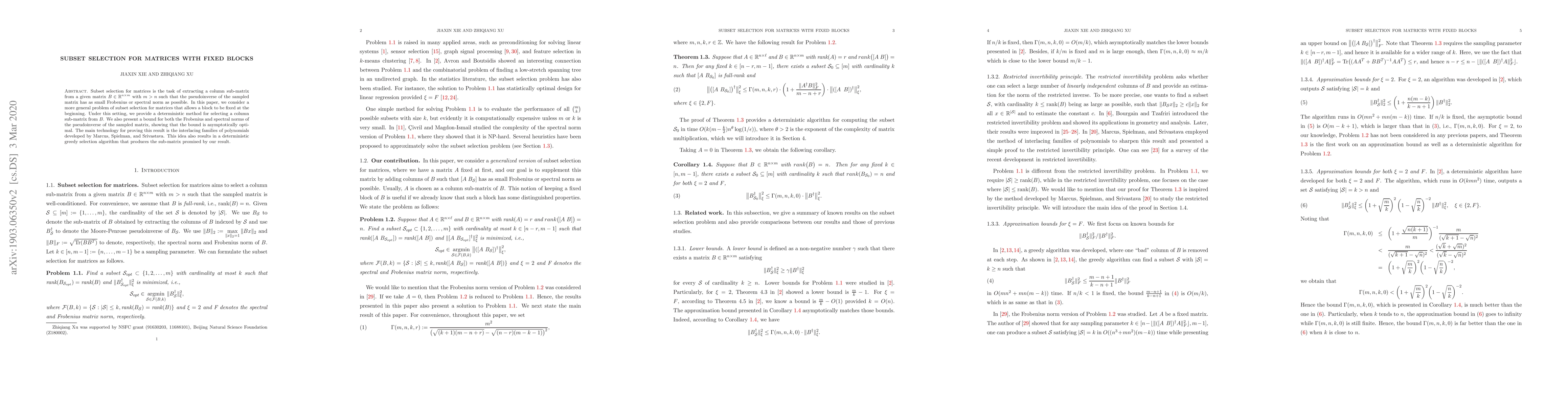 Subset selection for matrices is the task of extracting a column sub-matrix from a given matrix $B\in\mathbb{R}^{n\times m}$ with $m>n$ such that the pseudoinverse of the sampled matrix has as small Frobenius or spectral norm as possible. In this paper, we consider a more general problem of subset selection for matrices that allows a block to be fixed at the beginning. Under this setting, we provide a deterministic method for selecting a column sub-matrix from $B$. We also present a bound for both the Frobenius and spectral norms of the pseudoinverse of the sampled matrix, showing that the bound is asymptotically optimal. The main technology for proving this result is the interlacing families of polynomials developed by Marcus, Spielman, and Srivastava. This idea also results in a deterministic greedy selection algorithm that produces the sub-matrix promised by our result.
