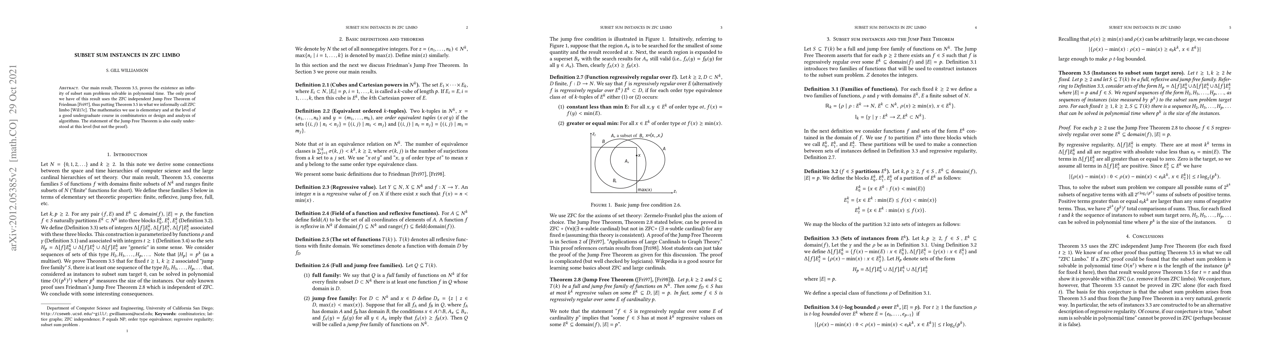 Our main result, Theorem 2.5, shows the existence of a vast infinity of subset sum problems solvable in polynomial time. The only proof we have of this result uses the ZFC independent Jump Free Theorem of Harvey Friedman, thus putting Theorem 2.5 in what we call ZFC limbo. The mathematics we use is elementary and at the level of a good undergraduate course in combinatorics or design and analysis of algorithms. The statement of the Jump Free Theorem is also easily understood at this level (but not the proof).