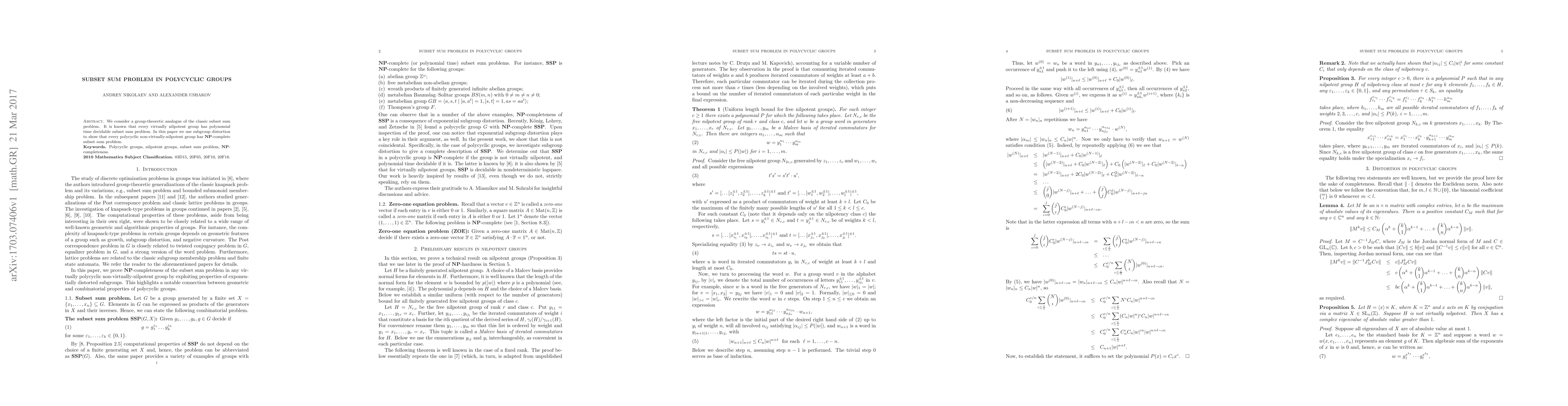 This paper investigates the subset sum problem in polycyclic groups, demonstrating that while virtually nilpotent groups solve it in polynomial time, non-virtually-nilpotent polycyclic groups exhibit an NP-complete subset sum problem using subgroup distortion techniques.
