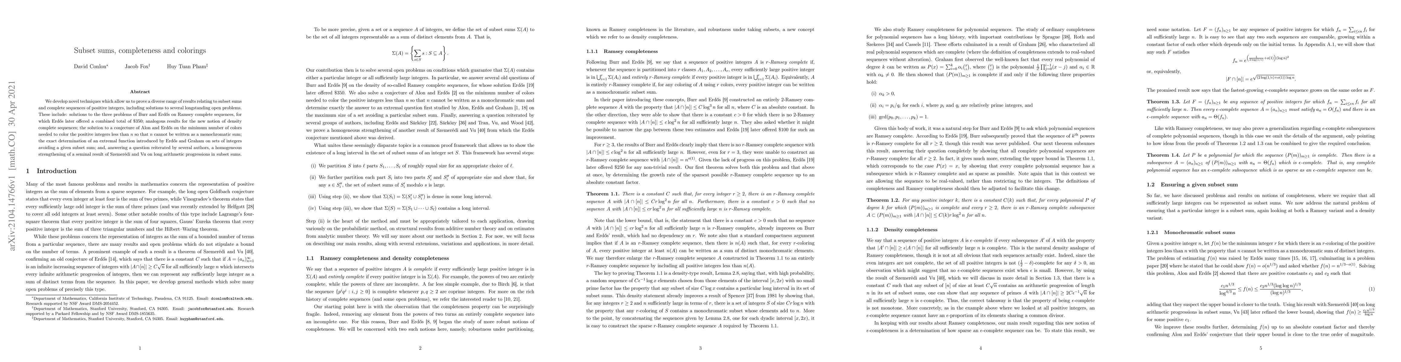 We develop novel techniques which allow us to prove a diverse range of results relating to subset sums and complete sequences of positive integers, including solutions to several longstanding open problems. These include: solutions to the three problems of Burr and Erd\H{o}s on Ramsey complete sequences, for which Erd\H{o}s later offered a combined total of \$350; analogous results for the new notion of density complete sequences; the solution to a conjecture of Alon and Erd\H{o}s on the minimum number of colors needed to color the positive integers less than $n$ so that $n$ cannot be written as a monochromatic sum; the exact determination of an extremal function introduced by Erd\H{o}s and Graham on sets of integers avoiding a given subset sum; and, answering a question reiterated by several authors, a homogeneous strengthening of a seminal result of Szemer\'edi and Vu on long arithmetic progressions in subset sums.