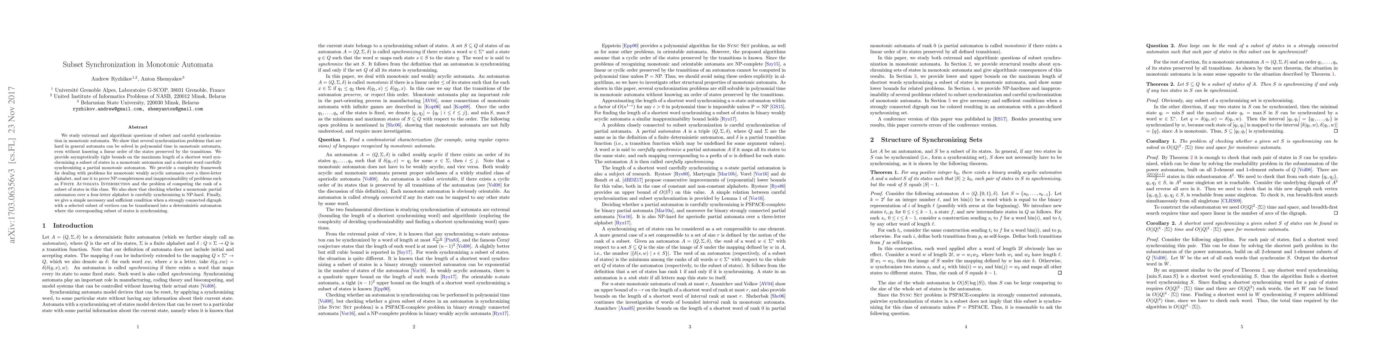 We study extremal and algorithmic questions of subset and careful synchronization in monotonic automata. We show that several synchronization problems that are hard in general automata can be solved in polynomial time in monotonic automata, even without knowing a linear order of the states preserved by the transitions. We provide asymptotically tight bounds on the maximum length of a shortest word synchronizing a subset of states in a monotonic automaton and a shortest word carefully synchronizing a partial monotonic automaton. We provide a complexity framework for dealing with problems for monotonic weakly acyclic automata over a three-letter alphabet, and use it to prove NP-completeness and inapproximability of problems such as {\sc Finite Automata Intersection} and the problem of computing the rank of a subset of states in this class. We also show that checking whether a monotonic partial automaton over a four-letter alphabet is carefully synchronizing is NP-hard. Finally, we give a simple necessary and sufficient condition when a strongly connected digraph with a selected subset of vertices can be transformed into a deterministic automaton where the corresponding subset of states is synchronizing.