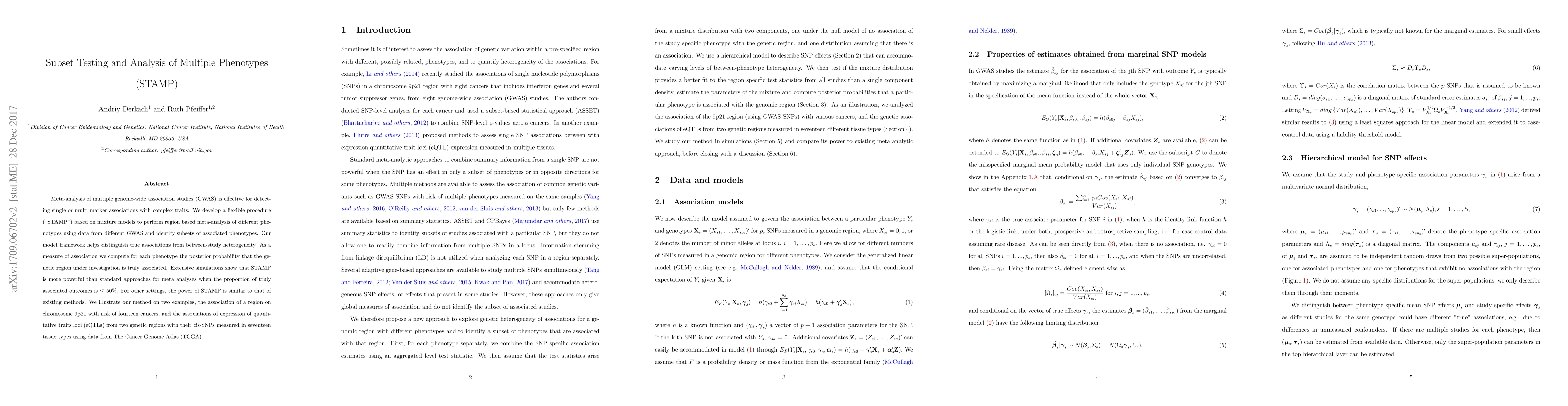 The paper introduces STAMP, a flexible mixture model for meta-analysis of multiple genome-wide association studies (GWAS) to identify subsets of associated phenotypes, distinguishing true associations from heterogeneity. STAMP shows greater power than standard methods for detecting associations when less than 50% of outcomes are truly associated.