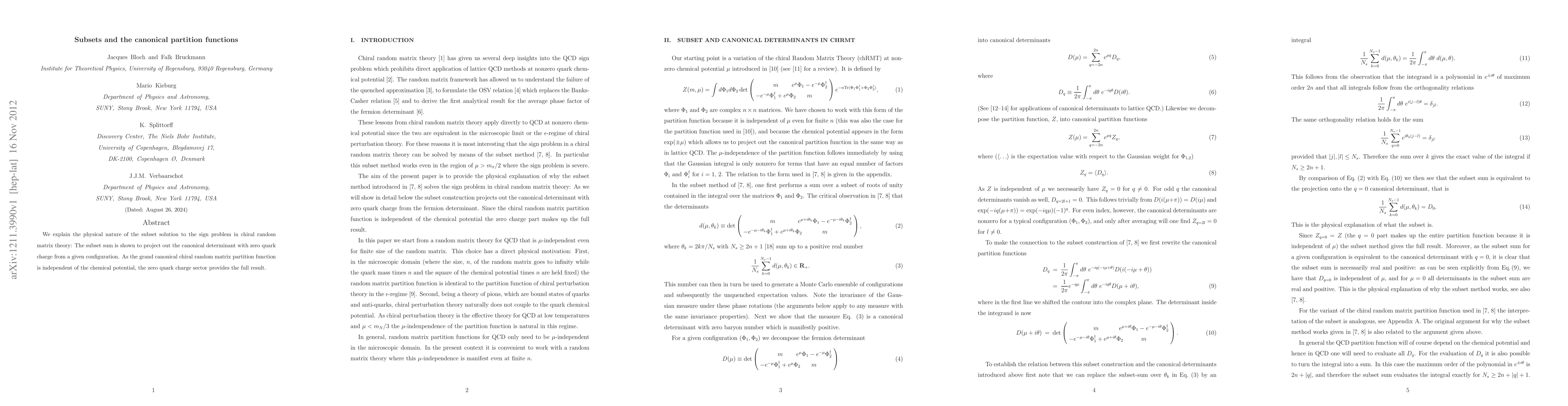 We explain the physical nature of the subset solution to the sign problem in chiral random matrix theory: The subset sum is shown to project out the canonical determinant with zero quark charge from a given configuration. As the grand canonical chiral random matrix partition function is independent of the chemical potential, the zero quark charge sector provides the full result.
