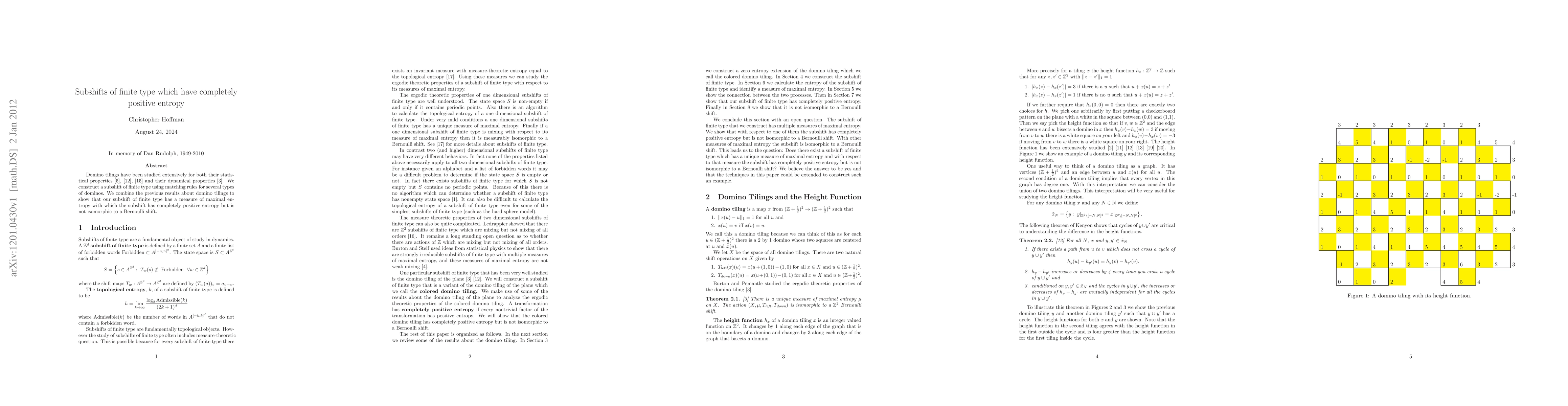 This paper constructs a subshift of finite type using matching rules for domino tilings, demonstrating that it has completely positive entropy and a measure of maximal entropy, while not being isomorphic to a Bernoulli shift. The study highlights the unique dynamical properties of this subshift.