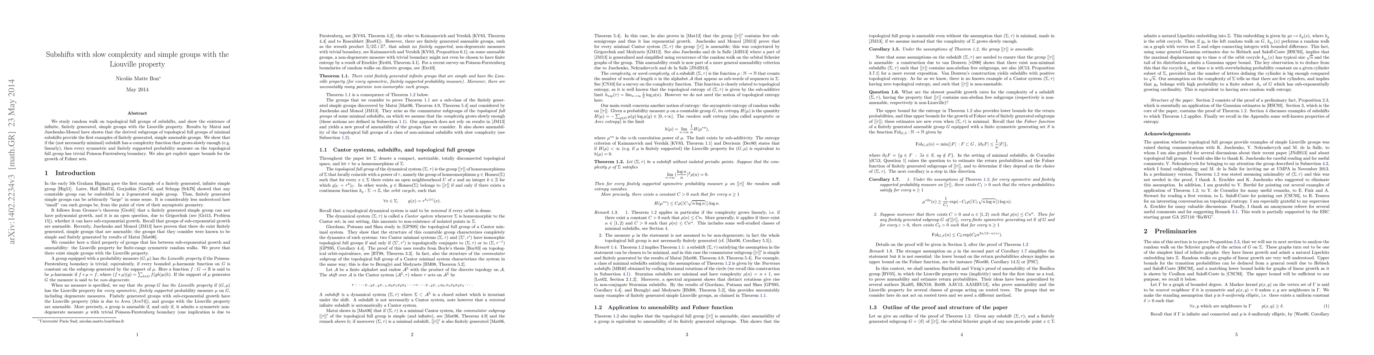 This paper investigates random walks on topological full groups of subshifts, revealing the existence of infinite, finitely generated simple groups with the Liouville property when the subshift's complexity function grows slowly, e.g., linearly. It demonstrates that under these conditions, every symmetric probability measure on the topological full group has a trivial Poisson-Furstenberg boundary.