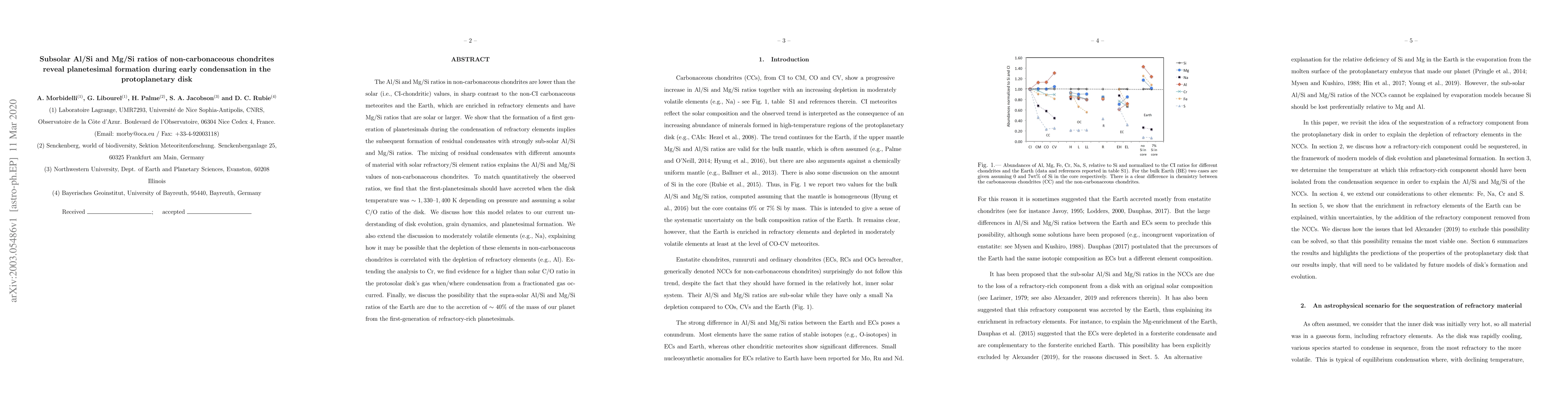 This paper investigates the Al/Si and Mg/Si ratios in non-carbonaceous chondrites, revealing they are lower than solar values due to the formation of early planetesimals during refractory element condensation. The study suggests that mixing of residual condensates with varying solar ratios explains these lower ratios, and proposes that first-generation planetesimals formed at disk temperatures of ~1,330-1,400 K.