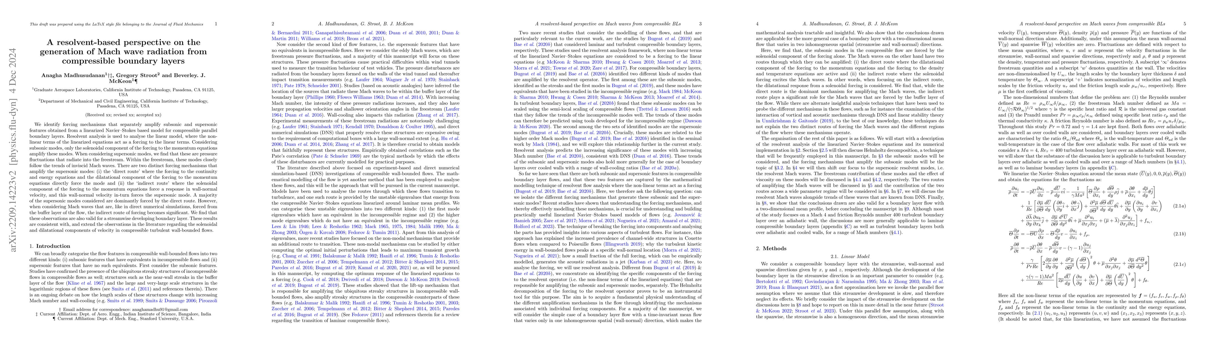 The paper introduces a resolvent-based decomposition of the nonlinear terms in linearized Navier-Stokes equations, providing a novel perspective on subsonic and supersonic mode amplification in compressible turbulent boundary layers.