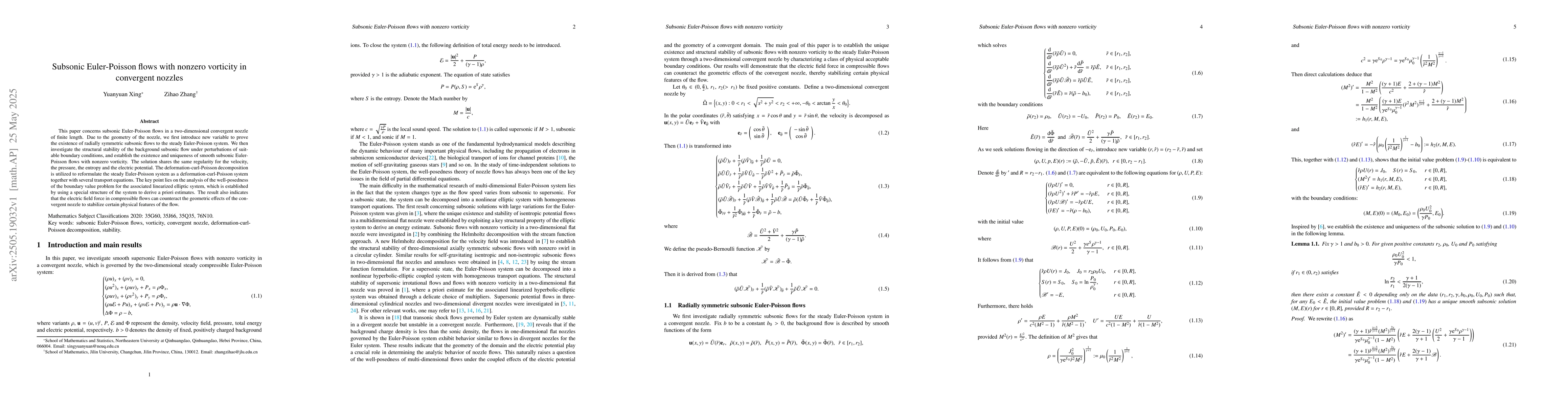 Researchers investigate subsonic Euler-Poisson flows in a convergent nozzle, finding that an electric field can stabilize certain flow features and establishing the existence of smooth flows with nonzero vorticity.