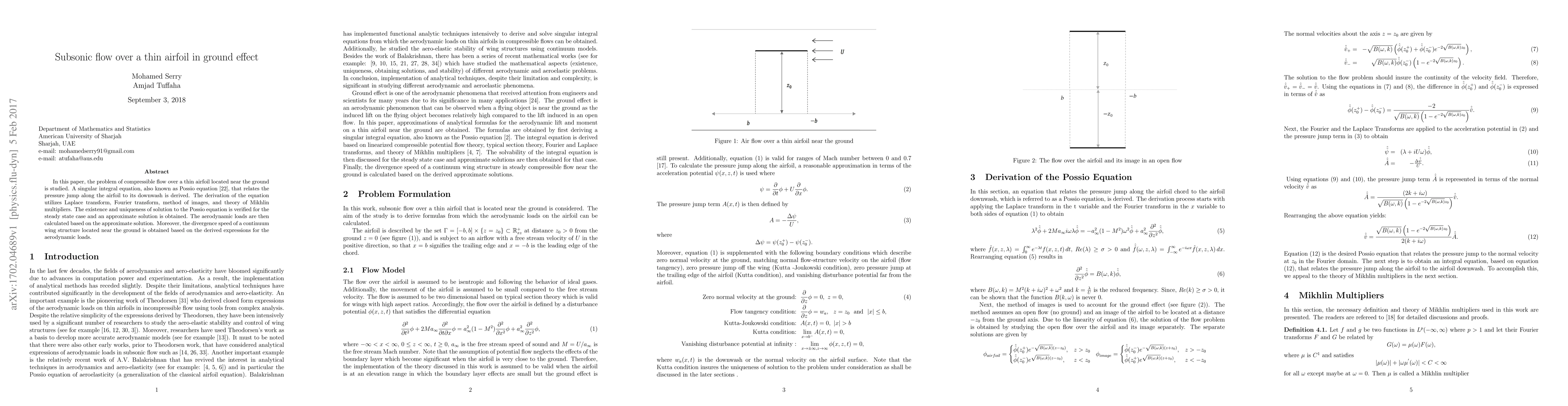In this paper, the problem of compressible flow over a thin airfoil located near the ground is studied. A singular integral equation, also known as Possio equation, that relates the pressure jump along the airfoil to its downwash is derived. The derivation of the equation utilizes Laplace transform, Fourier transform, method of images, and theory of Mikhlin multipliers. The existence and uniqueness of solution to the Possio equation is verified for the steady state case and an approximate solution is obtained. The aerodynamic loads are then calculated based on the approximate solution. Moreover, the divergence speed of a continuum wing structure located near the ground is obtained based on the derived expressions for the aerodynamic loads.