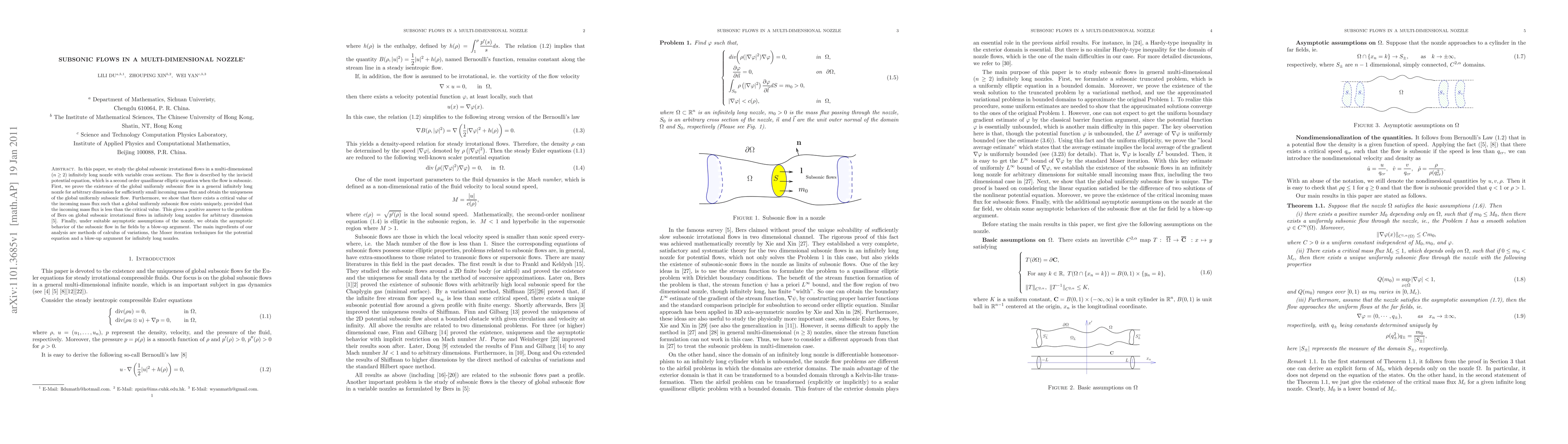 This paper proves the existence and uniqueness of global uniformly subsonic flows in multi-dimensional infinitely long nozzles with variable cross sections for small incoming mass flux, addressing Bers' problem. It also derives the asymptotic behavior of these flows in far fields using calculus of variations and blow-up arguments.