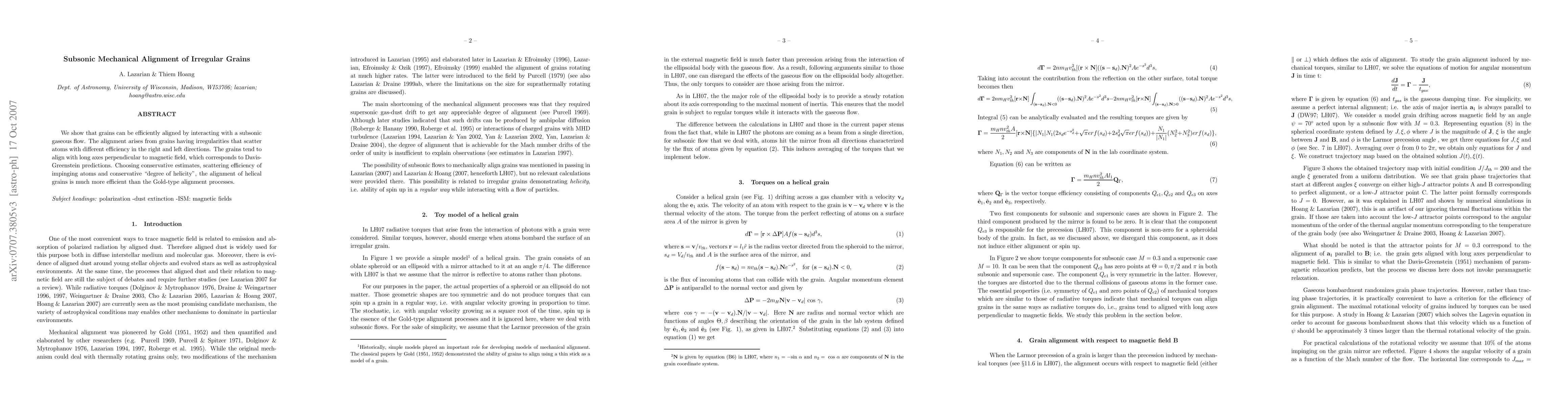 We show that grains can be efficiently aligned by interacting with a subsonic gaseous flow. The alignment arises from grains having irregularities that scatter atoms with different efficiency in the right and left directions. The grains tend to align with long axes perpendicular to magnetic field, which corresponds to Davis-Greenstein predictions. Choosing conservative estimates, scattering efficiency of impinging atoms and conservative ``degree of helicity'', the alignment of helical grains is much more efficient than the Gold-type alignment processes.