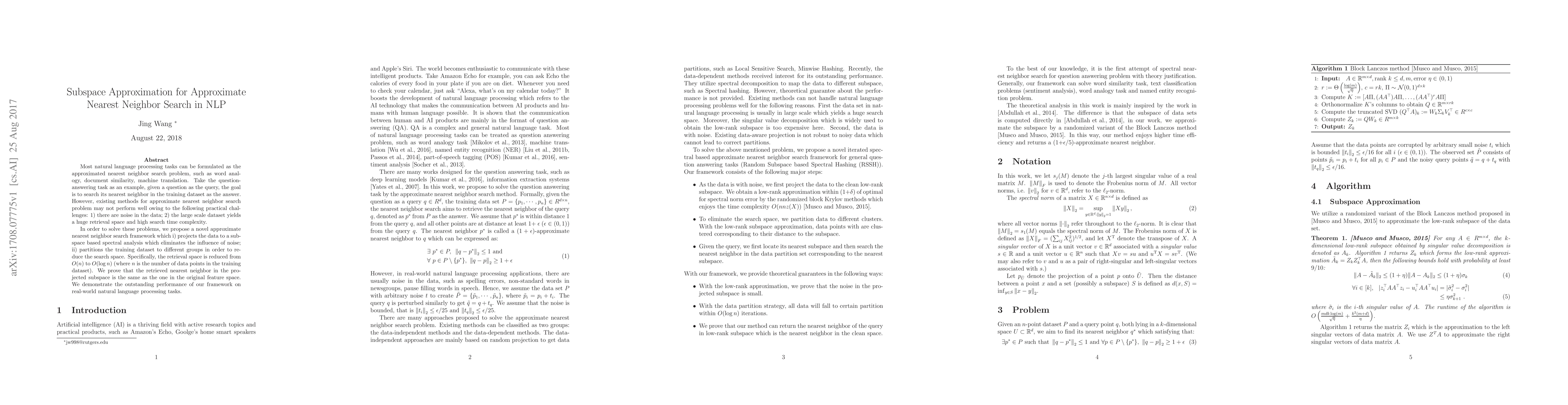 This paper proposes a novel framework for approximate nearest neighbor search in NLP that addresses noise and large dataset challenges by projecting data to a subspace and partitioning the dataset, reducing search time complexity from $O(n)$ to $O(\log n)$. The method maintains the accuracy of nearest neighbor retrieval in the original feature space.