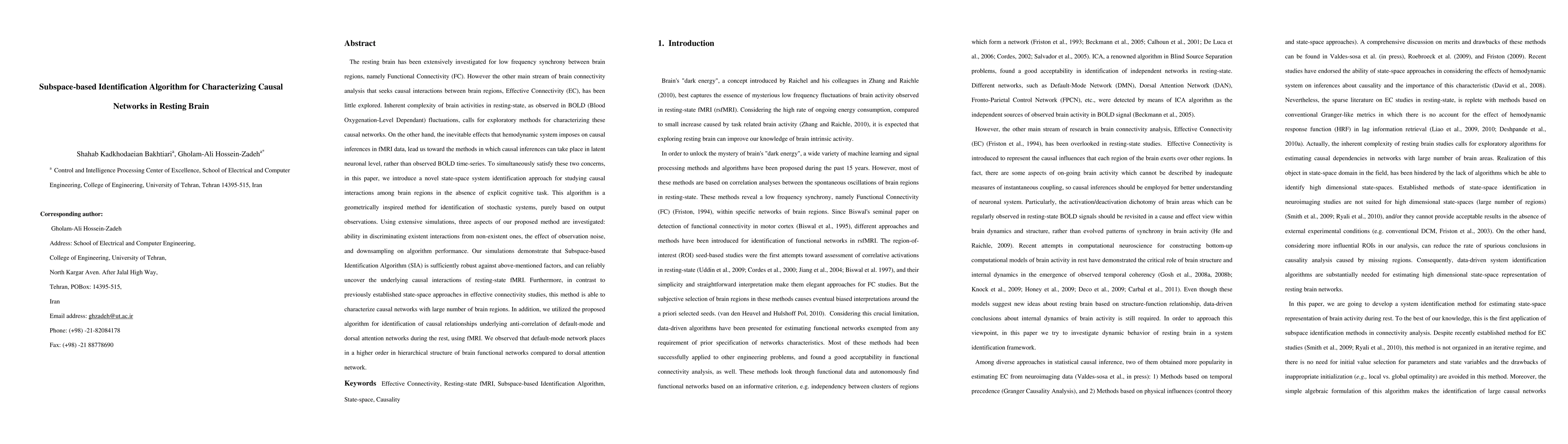 This paper introduces a novel Subspace-based Identification Algorithm (SIA) for characterizing causal networks in resting brain activity, addressing the complexity of spontaneous brain oscillations and the effects of the hemodynamic system on fMRI data. Simulations show that SIA is robust to network size and signal-to-noise ratio, effectively detecting effective connectivity in the absence of cognitive tasks.