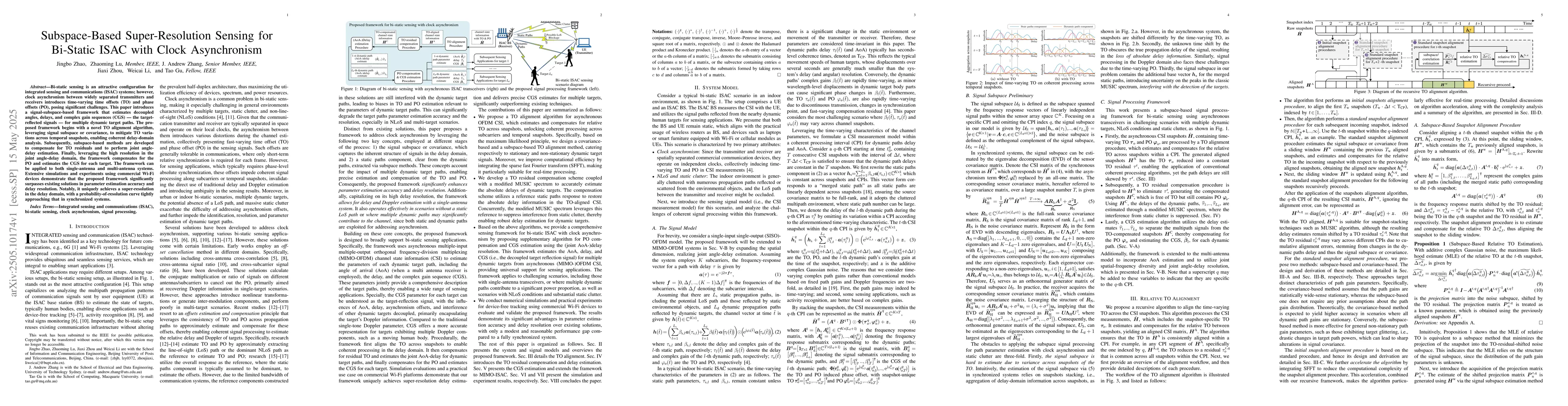 The main technical contribution is the development of a subspace-based super-resolution sensing framework for bi-static ISAC systems with clock asynchronism, which includes a novel TO alignment algorithm and methods for joint angle-delay estimation and PO compensation.