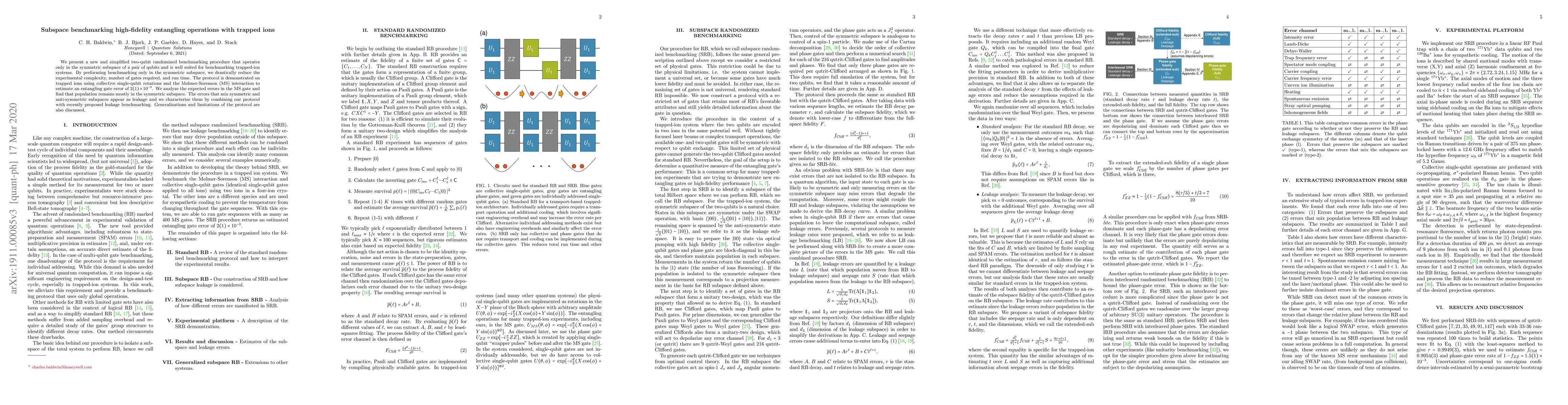 This paper introduces a simplified two-qubit randomized benchmarking method for trapped-ion systems that only operates in the symmetric subspace, significantly reducing experimental complexity and runtime. The protocol estimates an entangling gate error of $2(1) \times 10^{-3}$ and characterizes leakage errors that mix symmetric and anti-symmetric subspaces.