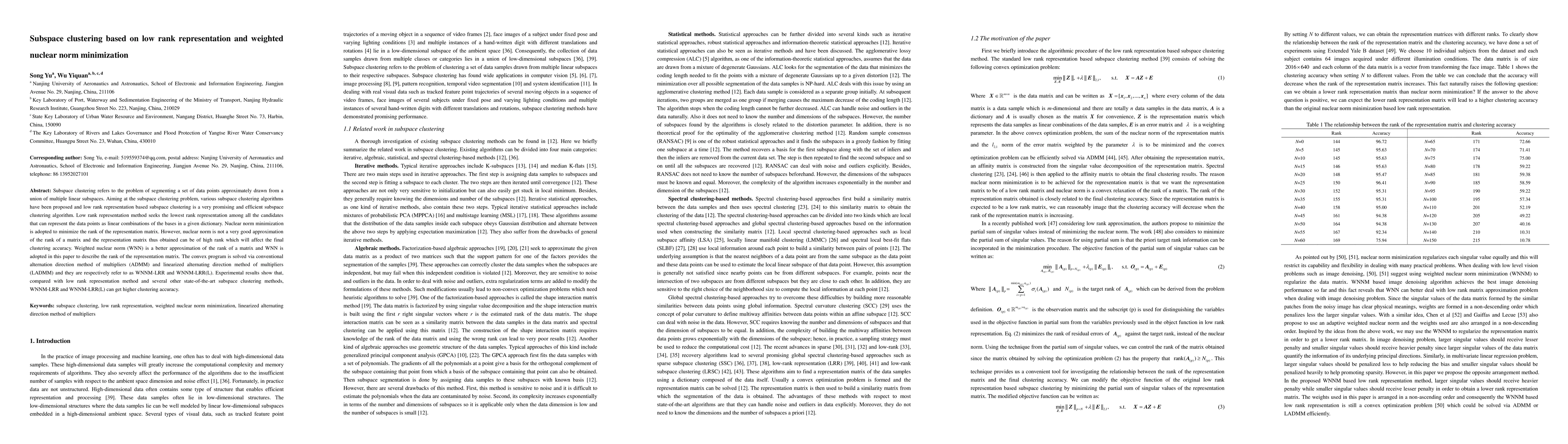 This paper proposes a subspace clustering method using weighted nuclear norm minimization for low rank representation, addressing the limitations of traditional nuclear norm in accurately approximating matrix rank. The new method, WNNM-LRR and its linearized version, WNNM-LRR(L), achieves higher clustering accuracy compared to other state-of-the-art methods.
