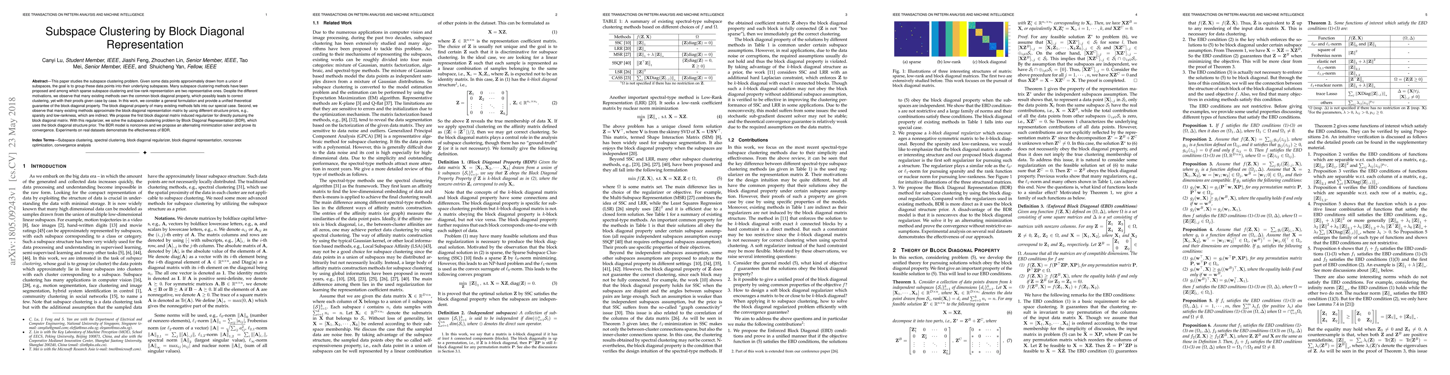 This paper proposes a unified theoretical framework for subspace clustering based on the block diagonal property, offering a novel regularizer to directly pursue this structure. The Block Diagonal Representation (BDR) model is solved using an alternating minimization solver, which is proven to converge, and demonstrated to be effective on real datasets.