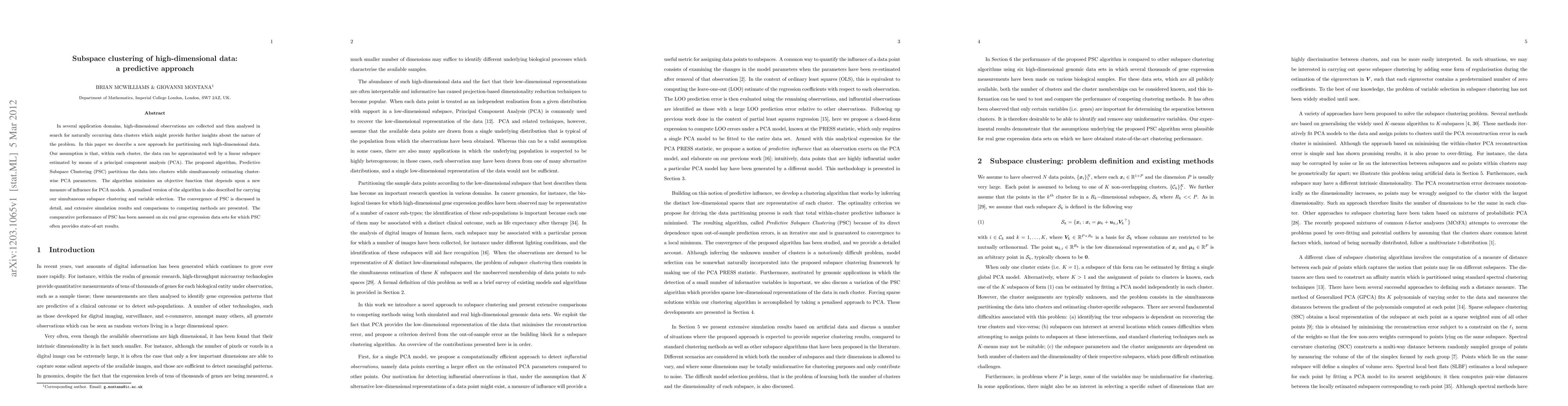 In several application domains, high-dimensional observations are collected and then analysed in search for naturally occurring data clusters which might provide further insights about the nature of the problem. In this paper we describe a new approach for partitioning such high-dimensional data. Our assumption is that, within each cluster, the data can be approximated well by a linear subspace estimated by means of a principal component analysis (PCA). The proposed algorithm, Predictive Subspace Clustering (PSC) partitions the data into clusters while simultaneously estimating cluster-wise PCA parameters. The algorithm minimises an objective function that depends upon a new measure of influence for PCA models. A penalised version of the algorithm is also described for carrying our simultaneous subspace clustering and variable selection. The convergence of PSC is discussed in detail, and extensive simulation results and comparisons to competing methods are presented. The comparative performance of PSC has been assessed on six real gene expression data sets for which PSC often provides state-of-art results.