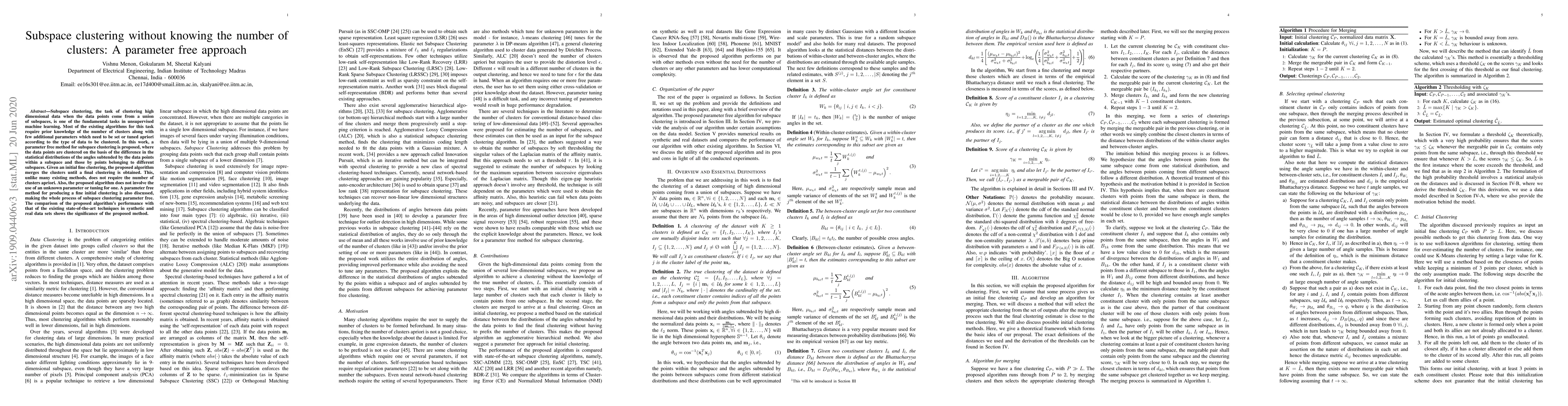 This research introduces a parameter-free method for subspace clustering, which groups high-dimensional data points into subspaces without needing prior knowledge of the number of clusters or additional parameters. The approach merges initial fine clusters until a final clustering is achieved, relying on the statistical distribution of angles within and between subspaces. The method also includes a parameter-free technique for generating an initial clustering. Evaluations on synthetic and real datasets demonstrate its effectiveness compared to existing state-of-the-art techniques.