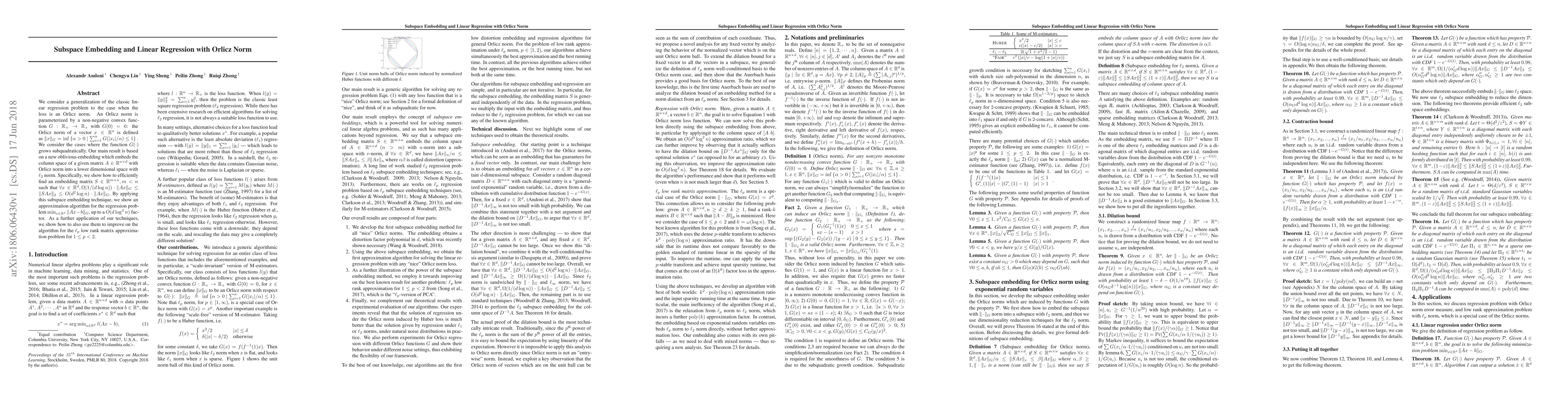 This paper proposes a subspace embedding technique to solve linear regression problems with Orlicz norm, achieving an approximation algorithm up to $O(d extlog n)$ factor, and extends its application to $oldsymbol{oldsymbol{ell}}_p$ low rank matrix approximation problem.