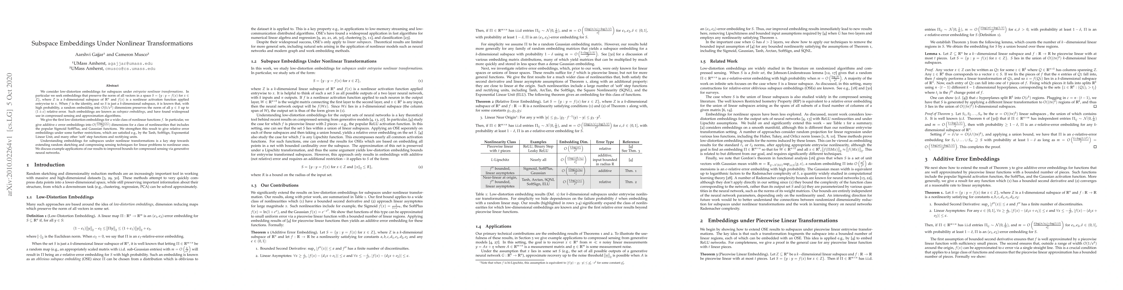 This paper introduces low-distortion embeddings for subspaces under nonlinear transformations, providing bounds on embedding dimensions for various nonlinear functions, and explores implications for compressed sensing and generative neural networks.