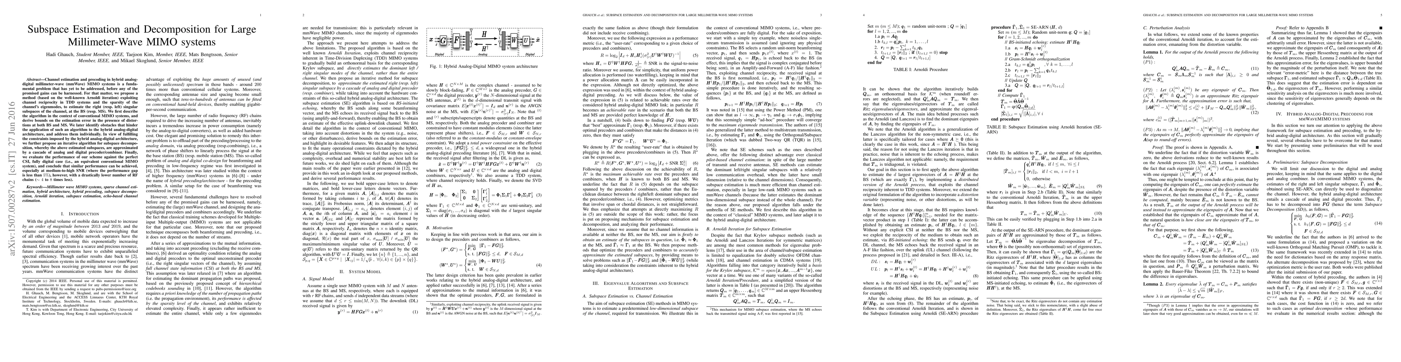 Channel estimation and precoding in hybrid analog-digital millimeter-wave (mmWave) MIMO systems is a fundamental problem that has yet to be addressed, before any of the promised gains can be harnessed. For that matter, we propose a method (based on the well-known Arnoldi iteration) exploiting channel reciprocity in TDD systems and the sparsity of the channel's eigenmodes, to estimate the right (resp. left) singular subspaces of the channel, at the BS (resp. MS). We first describe the algorithm in the context of conventional MIMO systems, and derive bounds on the estimation error in the presence of distortions at both BS and MS. We later identify obstacles that hinder the application of such an algorithm to the hybrid analog-digital architecture, and address them individually. In view of fulfilling the constraints imposed by the hybrid analog-digital architecture, we further propose an iterative algorithm for subspace decomposition, whereby the above estimated subspaces, are approximated by a cascade of analog and digital precoder / combiner. Finally, we evaluate the performance of our scheme against the perfect CSI, fully digital case (i.e., an equivalent conventional MIMO system), and conclude that similar performance can be achieved, especially at medium-to-high SNR (where the performance gap is less than 5%), however, with a drastically lower number of RF chains (4 to 8 times less).