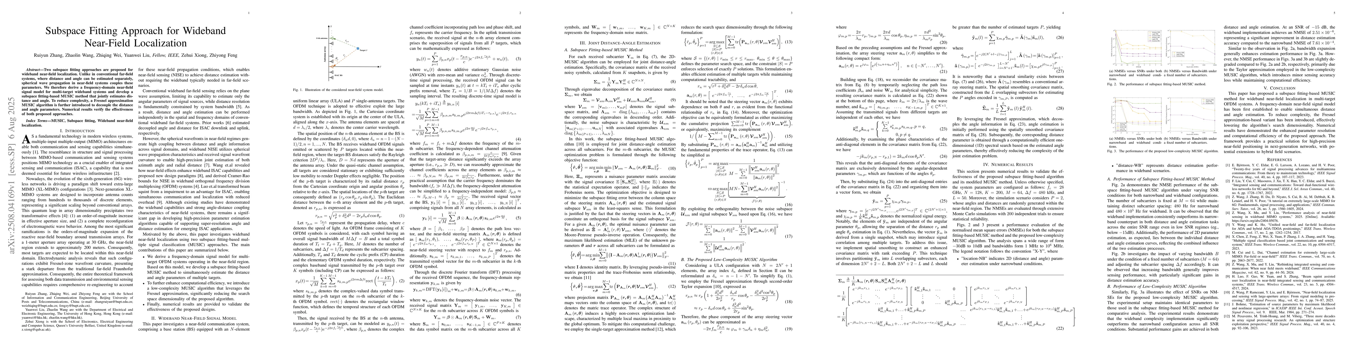 Two subspace fitting approaches are proposed for wideband near-field localization. Unlike in conventional far-field systems, where distance and angle can be estimated separately, spherical wave propagation in near-field systems couples these parameters. We therefore derive a frequency-domain near-field signal model for multi-target wideband systems and develop a subspace fitting-based MUSIC method that jointly estimates distance and angle. To reduce complexity, a Fresnel approximation MUSIC algorithm is further introduced to decouple the distance and angle parameters. Numerical results verify the effectiveness of both proposed approaches.