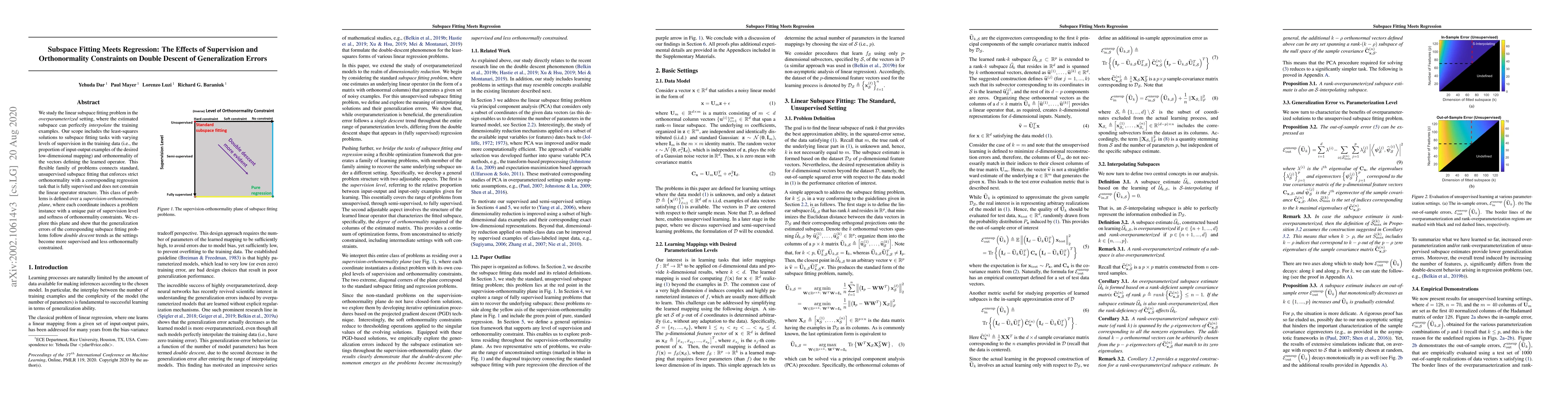 We study the linear subspace fitting problem in the overparameterized setting, where the estimated subspace can perfectly interpolate the training examples. Our scope includes the least-squares solutions to subspace fitting tasks with varying levels of supervision in the training data (i.e., the proportion of input-output examples of the desired low-dimensional mapping) and orthonormality of the vectors defining the learned operator. This flexible family of problems connects standard, unsupervised subspace fitting that enforces strict orthonormality with a corresponding regression task that is fully supervised and does not constrain the linear operator structure. This class of problems is defined over a supervision-orthonormality plane, where each coordinate induces a problem instance with a unique pair of supervision level and softness of orthonormality constraints. We explore this plane and show that the generalization errors of the corresponding subspace fitting problems follow double descent trends as the settings become more supervised and less orthonormally constrained.