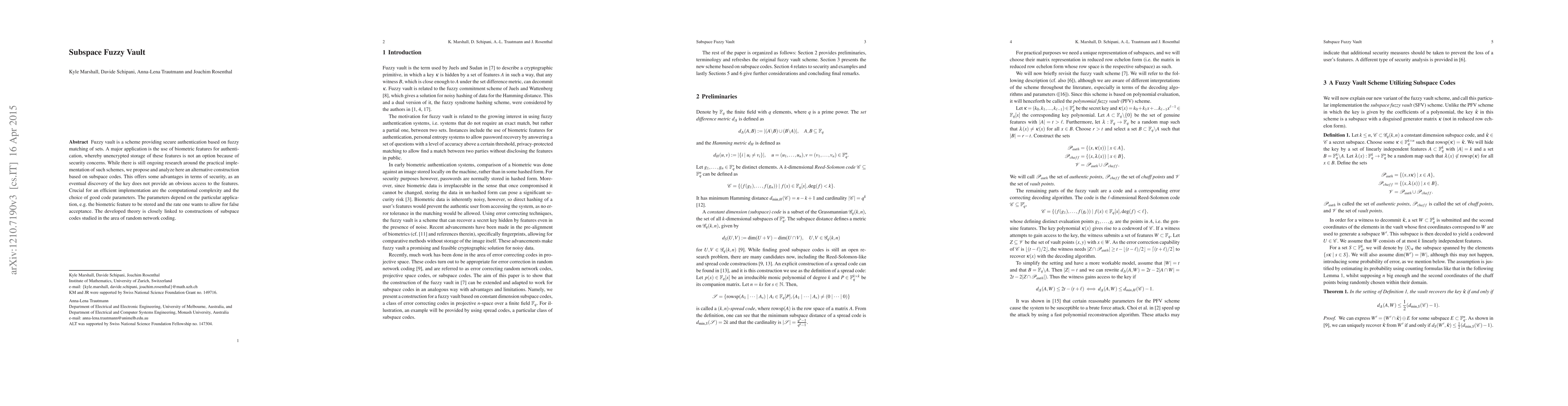 The Subspace Fuzzy Vault proposes a secure authentication scheme using subspace codes instead of traditional fuzzy vaults, enhancing security by preventing direct access to biometric features even if the key is discovered. The computational complexity and code parameters are crucial for practical implementation, tailored to specific applications and desired false acceptance rates.