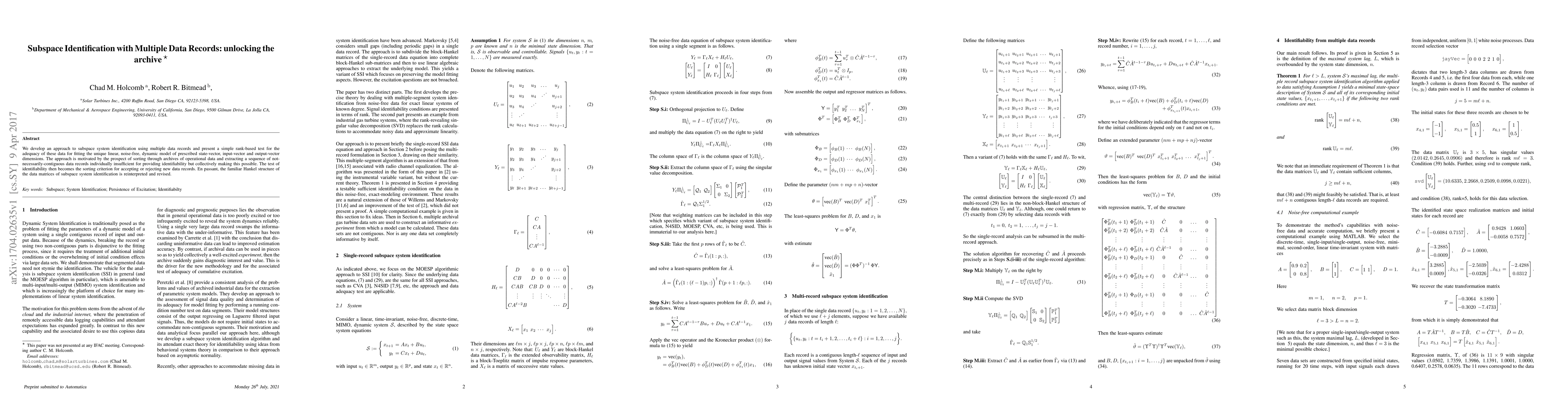 Researchers developed a method to analyze multiple data records for subspace system identification, allowing them to extract useful information from archives of operational data. The approach involves testing the identifiability of each data record and sorting them based on this test, enabling the selection of relevant data.