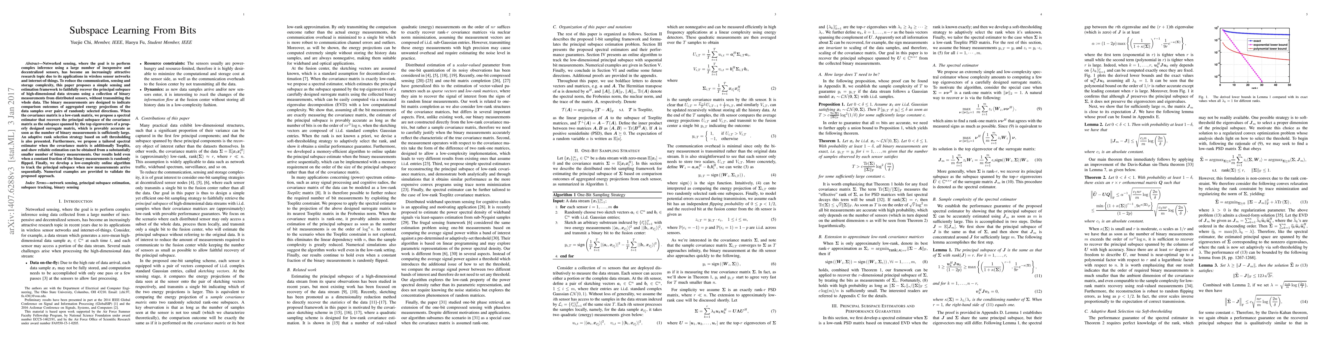 This paper proposes a method to recover the principal subspace of high-dimensional data streams using binary measurements from distributed sensors, reducing communication, sensing, and storage complexity. It presents a spectral estimator, an adaptive rank selection strategy, and a tailored estimator for low-rank, Toeplitz covariance matrices, all provably accurate with sufficient binary measurements, even with a small fraction of flipped bits. An online algorithm for tracking the principal subspace as new measurements arrive is also developed.