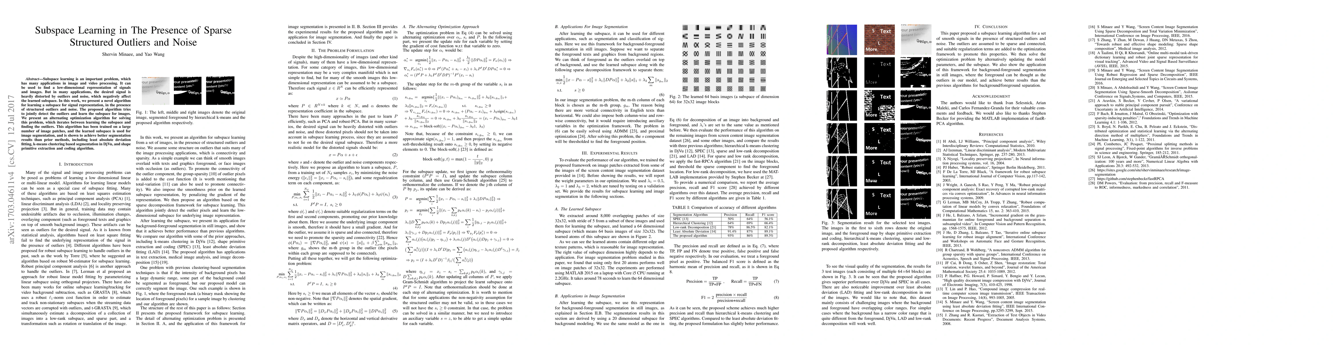 This paper introduces a novel algorithm for subspace learning in the presence of sparse structured outliers and noise, employing an alternating optimization approach to iteratively detect outliers and learn the subspace. The method achieves superior image segmentation results compared to existing methods.