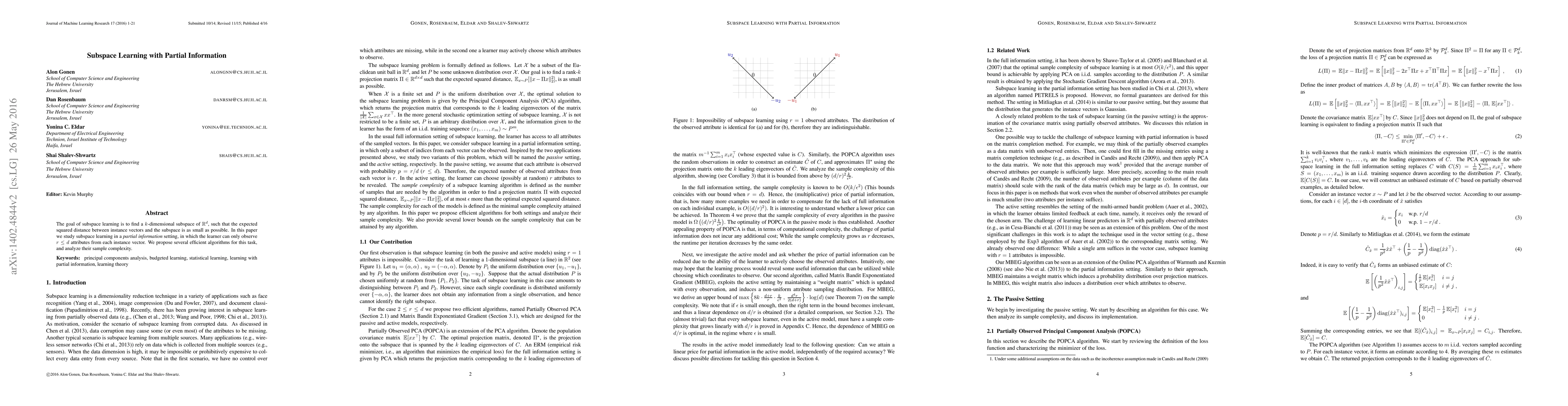 The goal of subspace learning is to find a $k$-dimensional subspace of $\mathbb{R}^d$, such that the expected squared distance between instance vectors and the subspace is as small as possible. In this paper we study subspace learning in a partial information setting, in which the learner can only observe $r \le d$ attributes from each instance vector. We propose several efficient algorithms for this task, and analyze their sample complexity