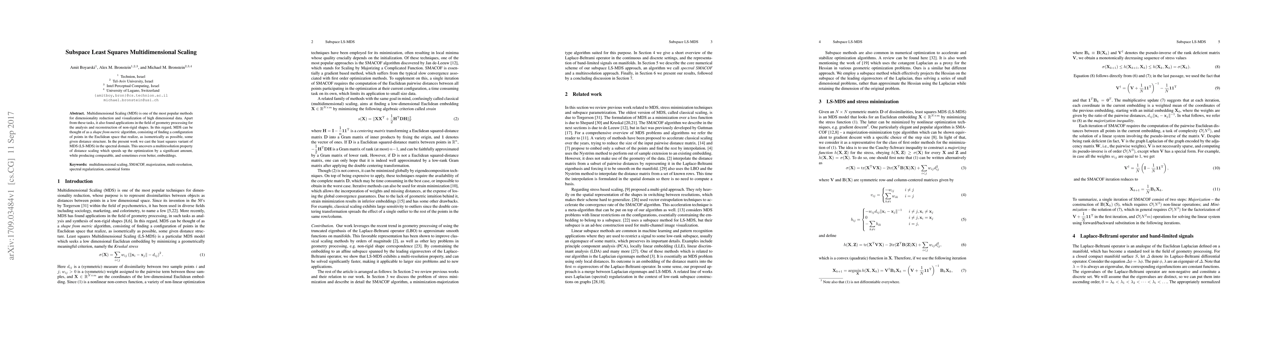 This paper proposes a new method for Multidimensional Scaling (MDS) called Subspace Least Squares Multidimensional Scaling, which improves upon traditional MDS by leveraging multiresolution properties to accelerate optimization and produce comparable or better embeddings.