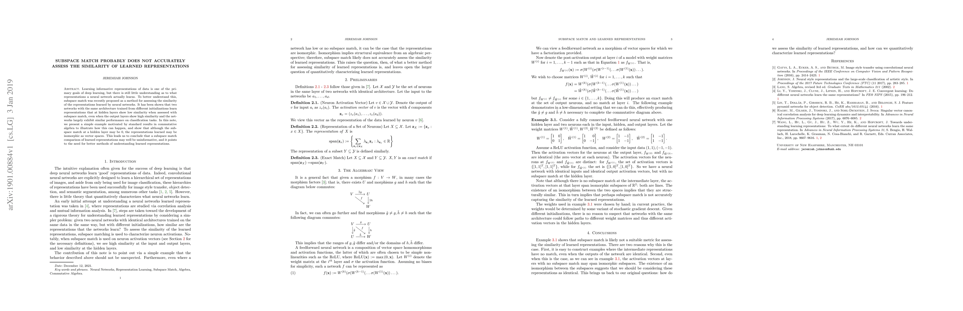 Learning informative representations of data is one of the primary goals of deep learning, but there is still little understanding as to what representations a neural network actually learns. To better understand this, subspace match was recently proposed as a method for assessing the similarity of the representations learned by neural networks. It has been shown that two networks with the same architecture trained from different initializations learn representations that at hidden layers show low similarity when assessed with subspace match, even when the output layers show high similarity and the networks largely exhibit similar performance on classification tasks. In this note, we present a simple example motivated by standard results in commutative algebra to illustrate how this can happen, and show that although the subspace match at a hidden layer may be 0, the representations learned may be isomorphic as vector spaces. This leads us to conclude that a subspace match comparison of learned representations may well be uninformative, and it points to the need for better methods of understanding learned representations.