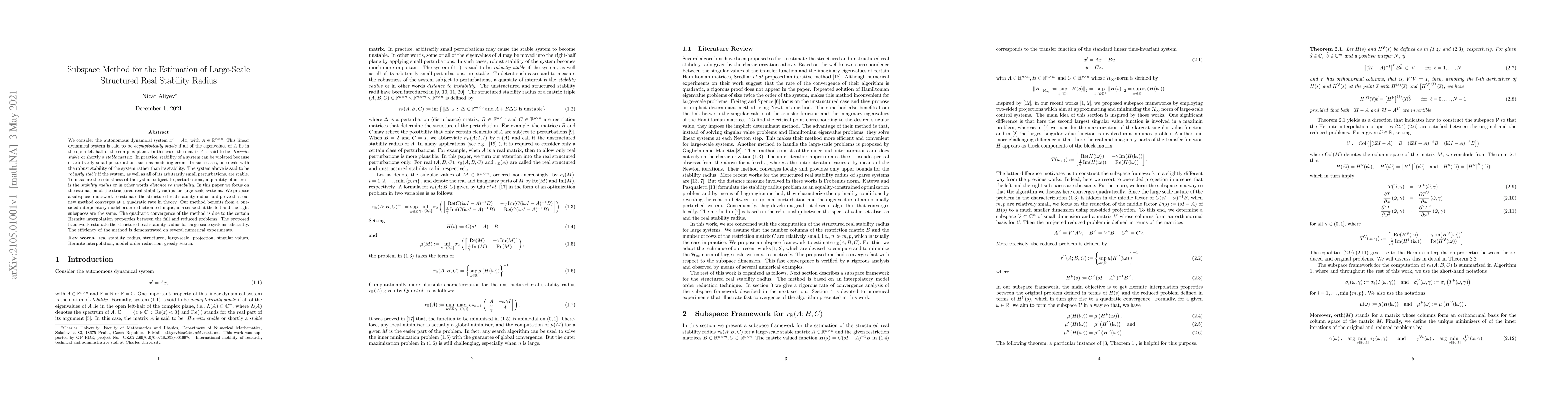 We consider the autonomous dynamical system $x' = Ax$, with $A \in \mathbb{R}^{n\times n}$. This linear dynamical system is said to be asymptotically stable if all of the eigenvalues of A lie in the open left-half of the complex plane. In this case, the matrix A is said to be Hurwitz stable or shortly a stable matrix. In practice, stability of a system can be violated because of arbitrarily small perturbations such as modeling errors. In such cases, one deals with the robust stability of the system rather than its stability. The system above is said to be robustly stable if the system, as well as all of its arbitrarily small perturbations, are stable. To measure the robustness of the system subject to perturbations, a quantity of interest is the stability radius or in other words distance to instability. In this paper we focus on the estimation of the structured real stability radius for large-scale systems. We propose a subspace framework to estimate the structured real stability radius and prove that our new method converges at a quadratic rate in theory. Our method benefits from a one-sided interpolatory model order reduction technique, in a sense that the left and the right subspaces are the same. The quadratic convergence of the method is due to the certain Hermite interpolation properties between the full and reduced problems. The proposed framework estimate the structured real stability radius for large-scale systems efficiently. The efficiency of the method is demonstrated on several numerical experiments. Key words. real stability radius, structured, large-scale, projection, singular values, Hermite interpolation, model order reduction, greedy search.