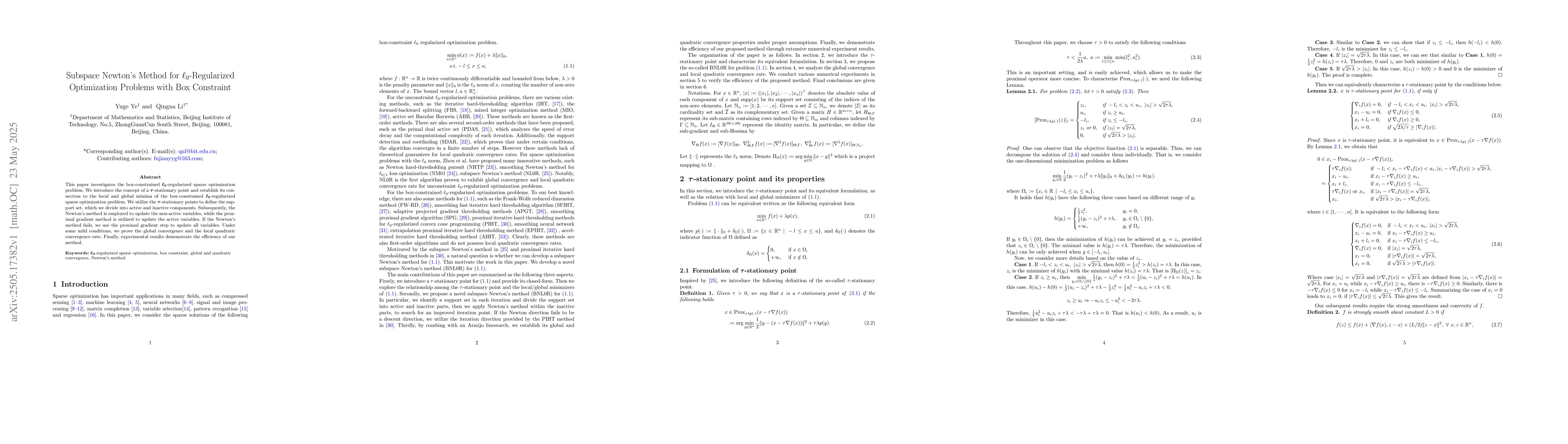 The paper introduces a Subspace Newton's Method for $\ell_0$-regularized optimization problems with box constraints, utilizing $\tau$-stationary points, support set division into active and inactive components, and alternating updates via Newton's method and proximal gradient method.