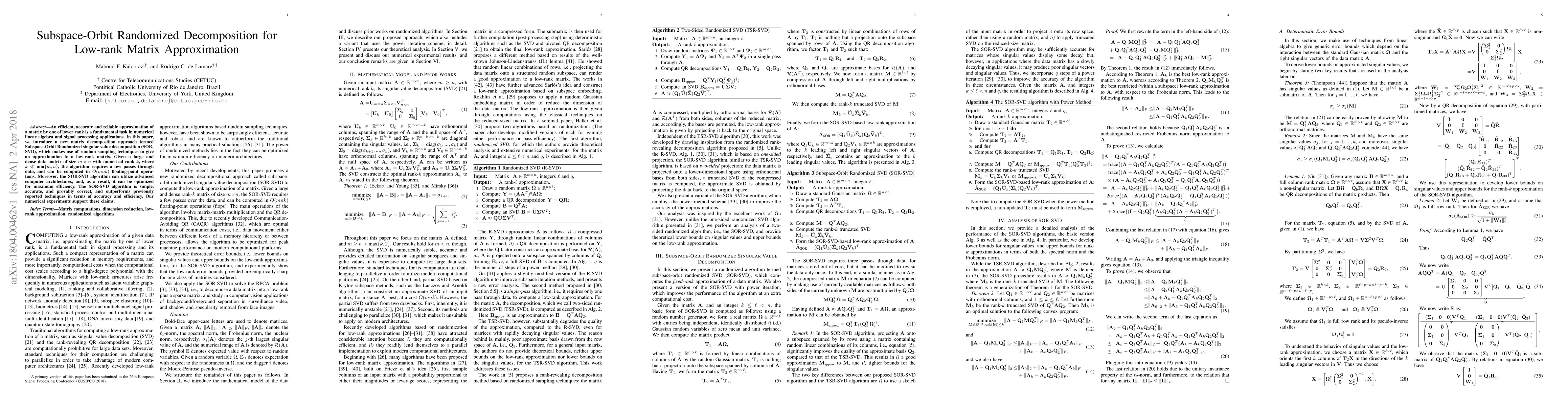 This paper introduces the Subspace-Orbit Randomized Singular Value Decomposition (SOR-SVD) for efficient low-rank matrix approximation, leveraging random sampling techniques. The SOR-SVD algorithm is simple, accurate, and outperforms existing methods, requiring only $O(mnk)$ operations and optimized for advanced computer architectures.