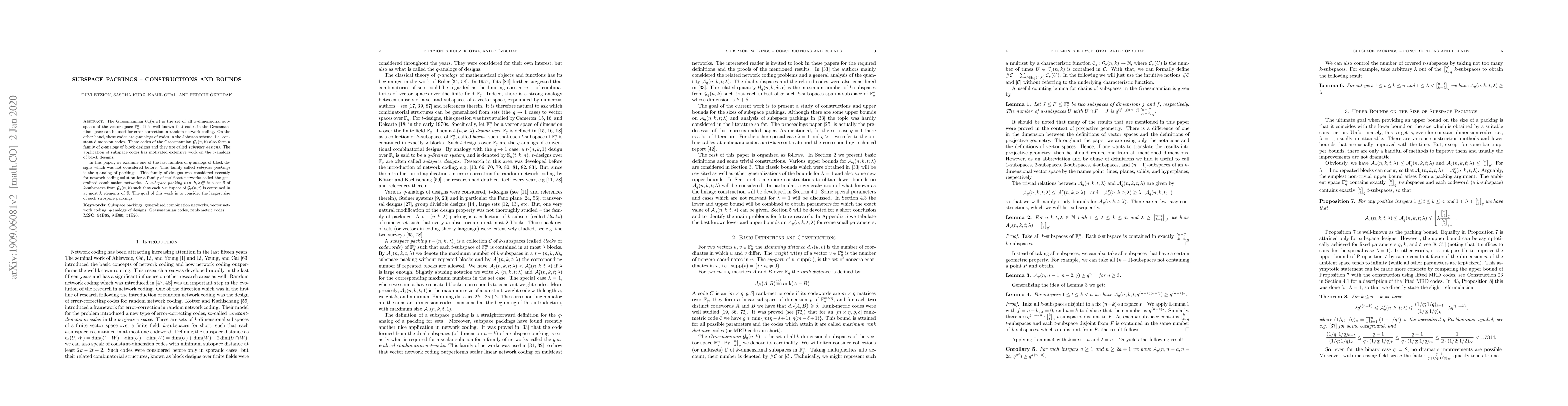 This paper explores the construction and bounds of subspace packings, which are $q$-analogs of packings in the Grassmannian $\mathcal{G}_q(n,k)$. The authors derive lower and upper bounds for the maximum size of these packings and discuss important open problems for future research.