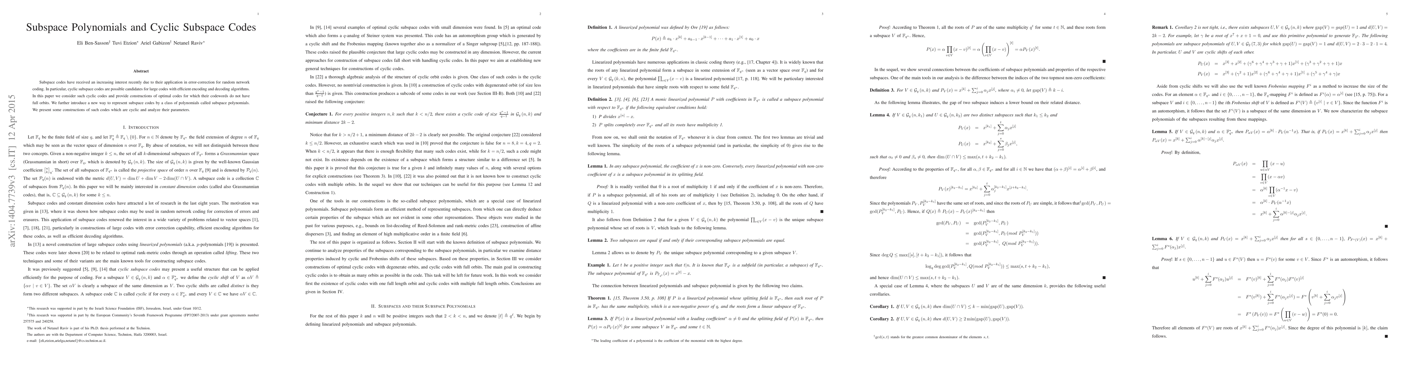 This paper explores cyclic subspace codes for error-correction in random network coding, presenting constructions of optimal codes with efficient encoding and decoding. It introduces subspace polynomials for representing these codes and analyzes their cyclic constructions and parameters.