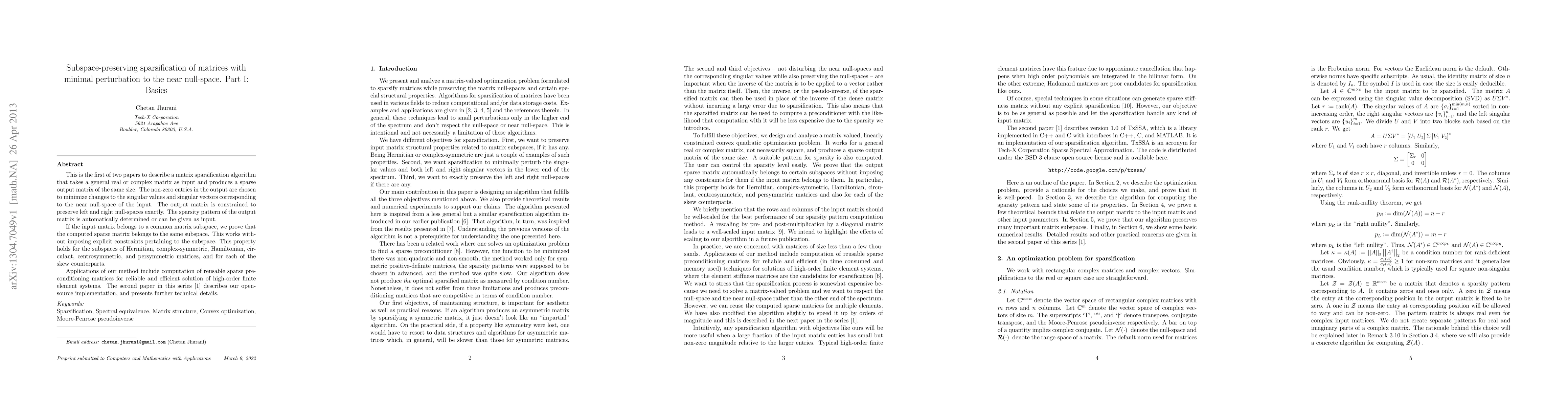 This is the first of two papers to describe a matrix sparsification algorithm that takes a general real or complex matrix as input and produces a sparse output matrix of the same size. The non-zero entries in the output are chosen to minimize changes to the singular values and singular vectors corresponding to the near null-space of the input. The output matrix is constrained to preserve left and right null-spaces exactly. The sparsity pattern of the output matrix is automatically determined or can be given as input. If the input matrix belongs to a common matrix subspace, we prove that the computed sparse matrix belongs to the same subspace. This works without imposing explicit constraints pertaining to the subspace. This property holds for the subspaces of Hermitian, complex-symmetric, Hamiltonian, circulant, centrosymmetric, and persymmetric matrices, and for each of the skew counterparts. Applications of our method include computation of reusable sparse preconditioning matrices for reliable and efficient solution of high-order finite element systems. The second paper in this series describes our open-source implementation, and presents further technical details.