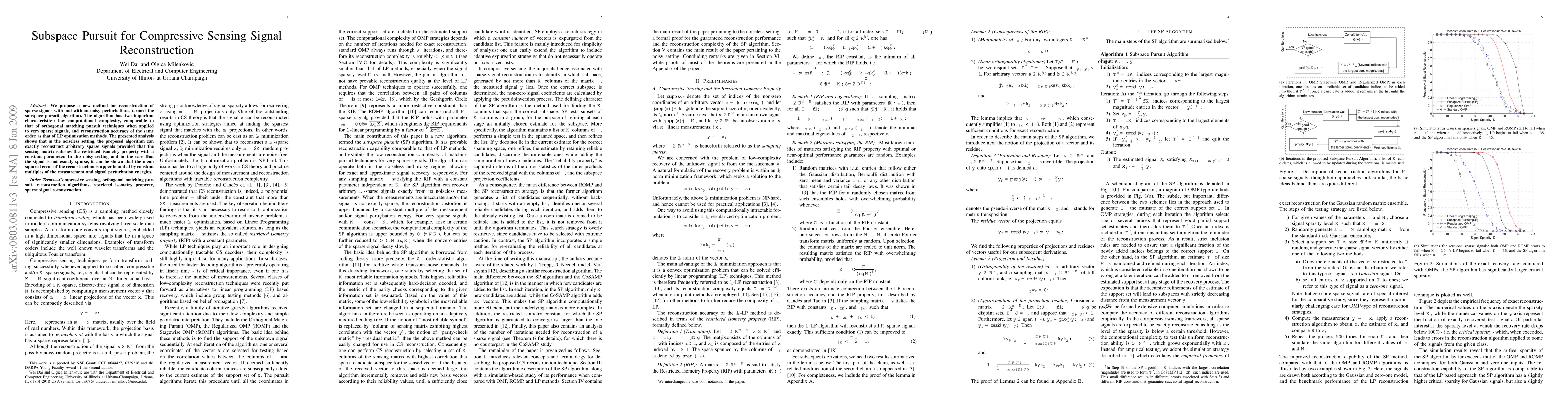 We propose a new method for reconstruction of sparse signals with and without noisy perturbations, termed the subspace pursuit algorithm. The algorithm has two important characteristics: low computational complexity, comparable to that of orthogonal matching pursuit techniques when applied to very sparse signals, and reconstruction accuracy of the same order as that of LP optimization methods. The presented analysis shows that in the noiseless setting, the proposed algorithm can exactly reconstruct arbitrary sparse signals provided that the sensing matrix satisfies the restricted isometry property with a constant parameter. In the noisy setting and in the case that the signal is not exactly sparse, it can be shown that the mean squared error of the reconstruction is upper bounded by constant multiples of the measurement and signal perturbation energies.