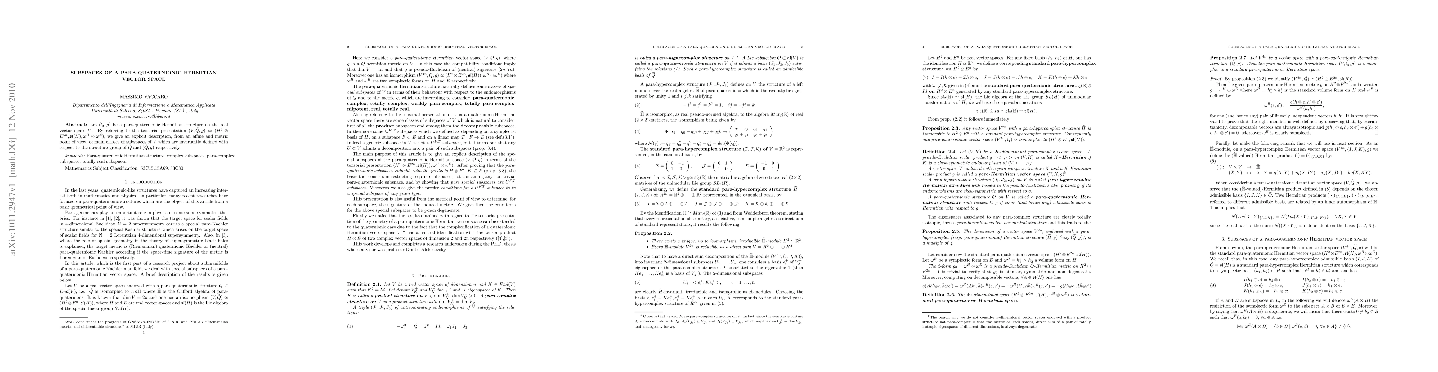 Let $(\tilde Q,g) $ be a para-quaternionic Hermitian structure on the real vector space $V$. By referring to the tensorial presentation $(V, \tilde{Q},g) \simeq (H^2 \otimes E^{2n}, \mathfrak{sl}(H),\omega^H \otimes \omega^E)$, we give an explicit description, from an affine and metric point of view, of main classes of subspaces of $V$ which are invariantly defined with respect to the structure group of $\tilde{Q}$ and $(\tilde{Q},g)$ respectively.